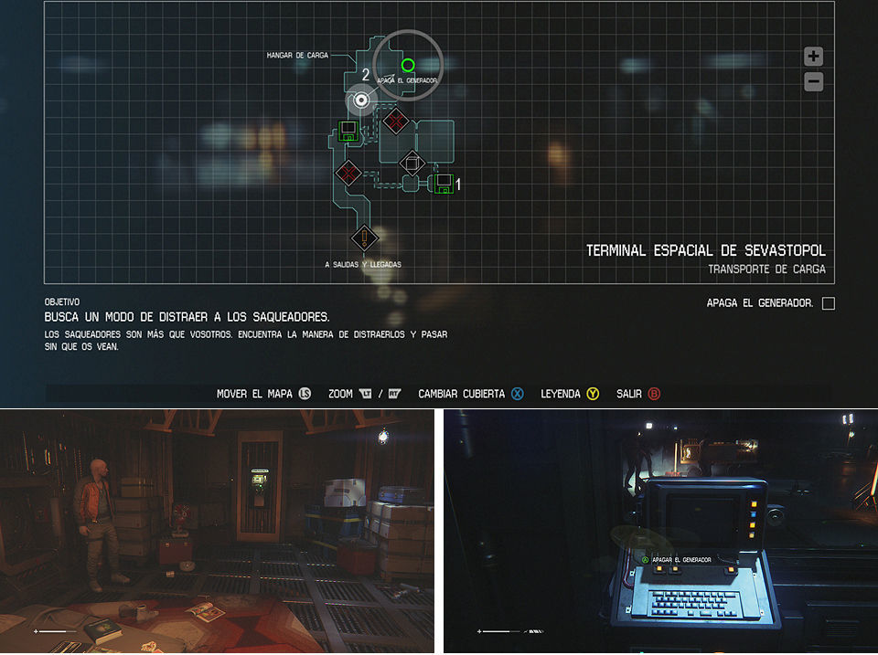 2. Al salir llegamos hasta una sala donde varios humanos están reunidos, sospechando que alguien esta entrando en su zona. Axel nos dice que tenemos que pasar por la puerta que esta al otro lado y que les distraigamos, hay que apagar el generador que está a la derecha del todo en una sala, vamos agachados por la oscuridad hasta el objetivo, cuando lo hagamos, vendrán rápidamente a la sala a comprobar por qué no hay energía. Justo al lado del terminal donde apagamos el generador, si miramos abajo, hay una trampilla en el suelo para meternos y evitar que nos descubran saliendo al otro lado. Nos reunimos con Axel en la puerta y continuamos.