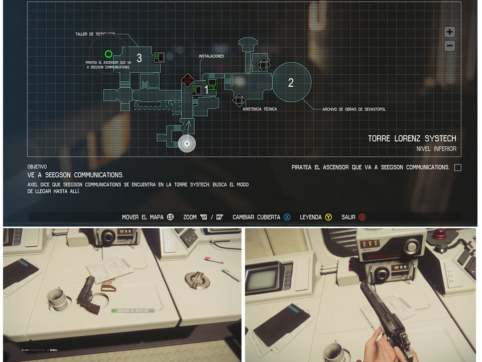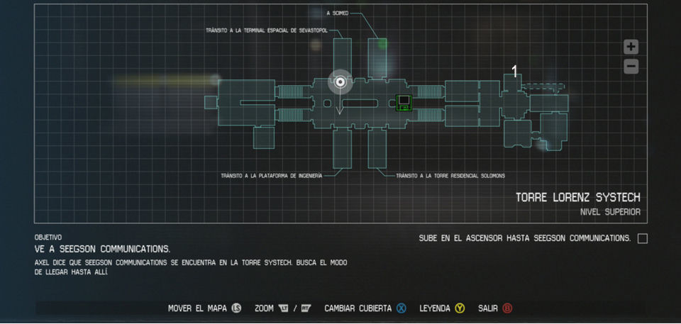 3. Al salir de la Asistencia Técnica vemos que el cierre de seguridad ha bloqueado el camino. Hay que ir a desactivarlo a la puerta que requería el Sintonizador al fondo a la izquierda del mapa, enfrente de la oficina de Asistencia Técnica, donde encontramos un panel para pulsar.