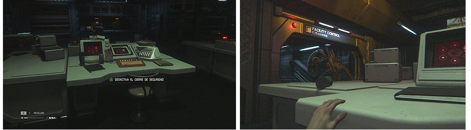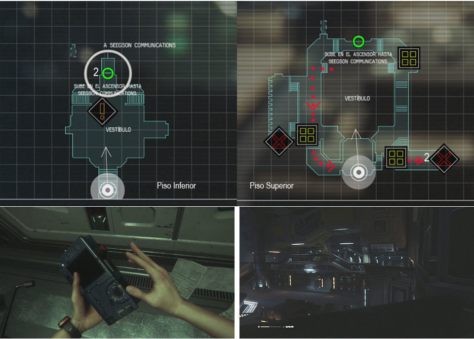 Al hacerlo el Alien hace acto de presencia justo por el conducto encima de la mesa del panel, cuidado con correr por si acaso. Subimos hasta la puerta que bloquearon los humanos, usamos el Sintonizador para cruzarla. Aquí si dejamos a algún humano vivo vemos cómo el Alien los elimina en el piso de abajo, cuidado que ahora si que puede localizarnos. Bajamos, registramos los cadáveres en busca de munición y accedemos al ascensor. La puerta del principio a la izquierda donde el tránsito y en la zona del ascensor en el segundo piso que pone "Kitchen", requieren una mejora el Sintonizador para ser abiertas.