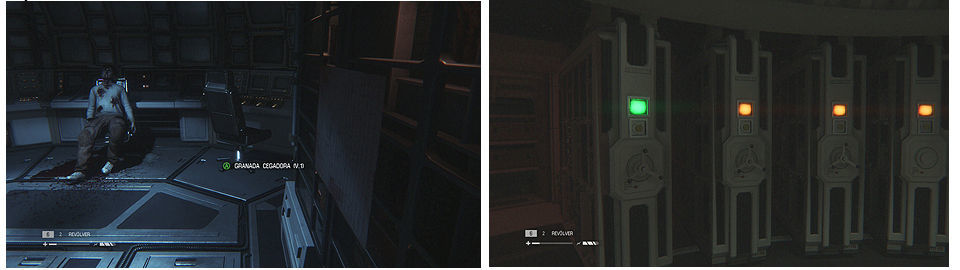2. Cuando cojamos todo vamos hasta la puerta que hay por detrás de la sala y entramos en Asistencia Técnica. En la sala grande tenemos ítems para recoger, en la sala de arriba donde esta el cadáver sobre el muro a la derecha tenemos los planos de "Granada Cegadora". Los cogemos y avanzamos a la sala redonda de la derecha, al entrar encontramos el registro de vuelo, pero está dañado y no nos sirve para nada. Se detecta una presencia y los cierres de seguridad nos impiden salir. Alrededor de la sala hay paneles de seguridad móviles que, si nos fijamos, hay uno con el botón operativo. Moviéndolos encontramos la célula para el Sintonizador, lo usamos para salir, volver hasta la sala donde lo recogimos y activar el ascensor