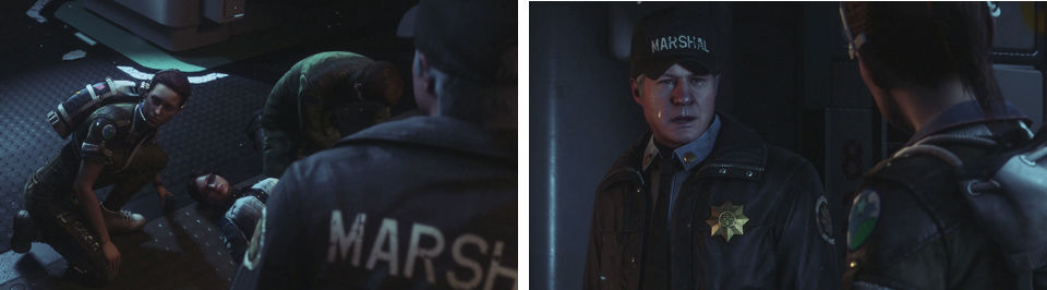 Al llegar a la estación de tránsito nuestros compañeros ya se han marchado, Samuels nos informa que cuando se han ido oían voces, con el panel de reprogramado podemos desbloquear una puerta en la estación. Eso sí, está custodiada por 4 humanos. Si tenemos las cosas adecuadas para hacerles frente adelante, aunque en la habitación solo hay items normales. Cogemos el tránsito hasta la torre Solomons. Al salir simplemente seguimos hacia el destino, pero registrando bien el trayecto, ya que hay bastantes ítems para recoger antes de llegar a la oficina de los Marshalls. Allí Waits nos agradece el haber reactivado el tránsito y nos invita a charlar con Marlow, uno de los viajeros de la nave que transportó el archivo de vuelo de la Nostromo y que una de sus tripulantes introdujo al Alien en su organismo.
