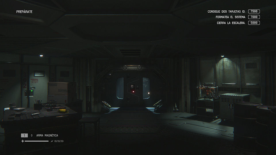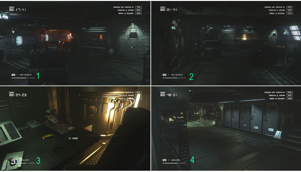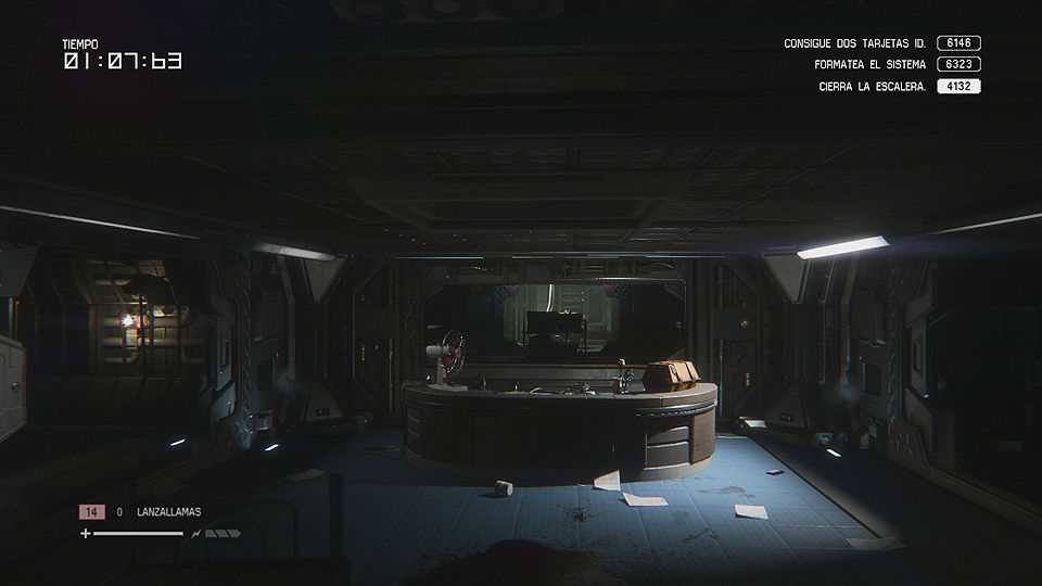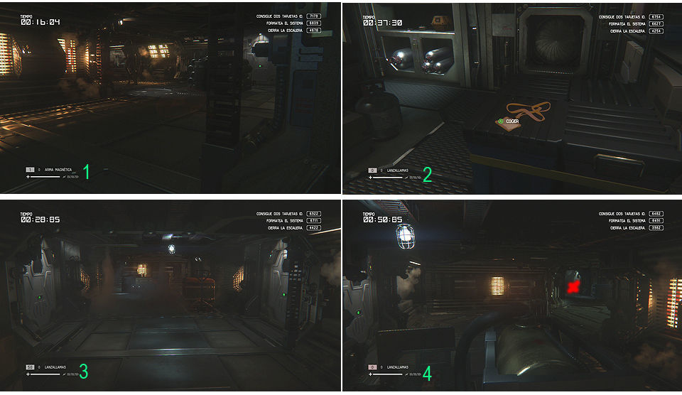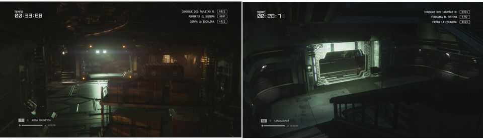 Al abrir la puerta de arriba, de frente veremos un generador a través de un cristal, ese es el que tenemos que activar para huir por el ascensor. Podemos ir por los 2 lados, pero por la derecha, al fondo en el pasillo oscuro tenemos otro de los objetivos, Formatea el Sistema, por la izquierda encontramos el ascensoir. En la mesa justo enfrente al generador tenemos otra Tarjeta ID por si no hemos cogido las 2 que hay en el piso de abajo cuando activemos el generador, el Alien viene a la zona seguro, mucho cuidado, lo mejor es usar el conducto que tenemos a la izquierda del generador para evitarle. Vamos hasta el ascensor.