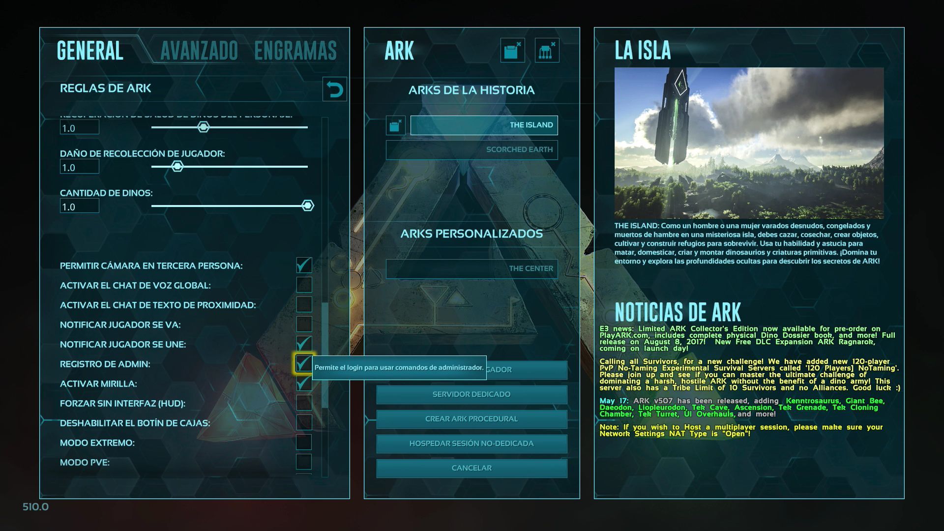 Antes de iniciar una partida hay que asegurarse de activar la casilla de Registro de Admin en la pestaña de General en la pantalla de creación de la partida. Una vez seleccionada inicia la partida en cualquier mapa, con cualquier personaje y en cualquier punto.