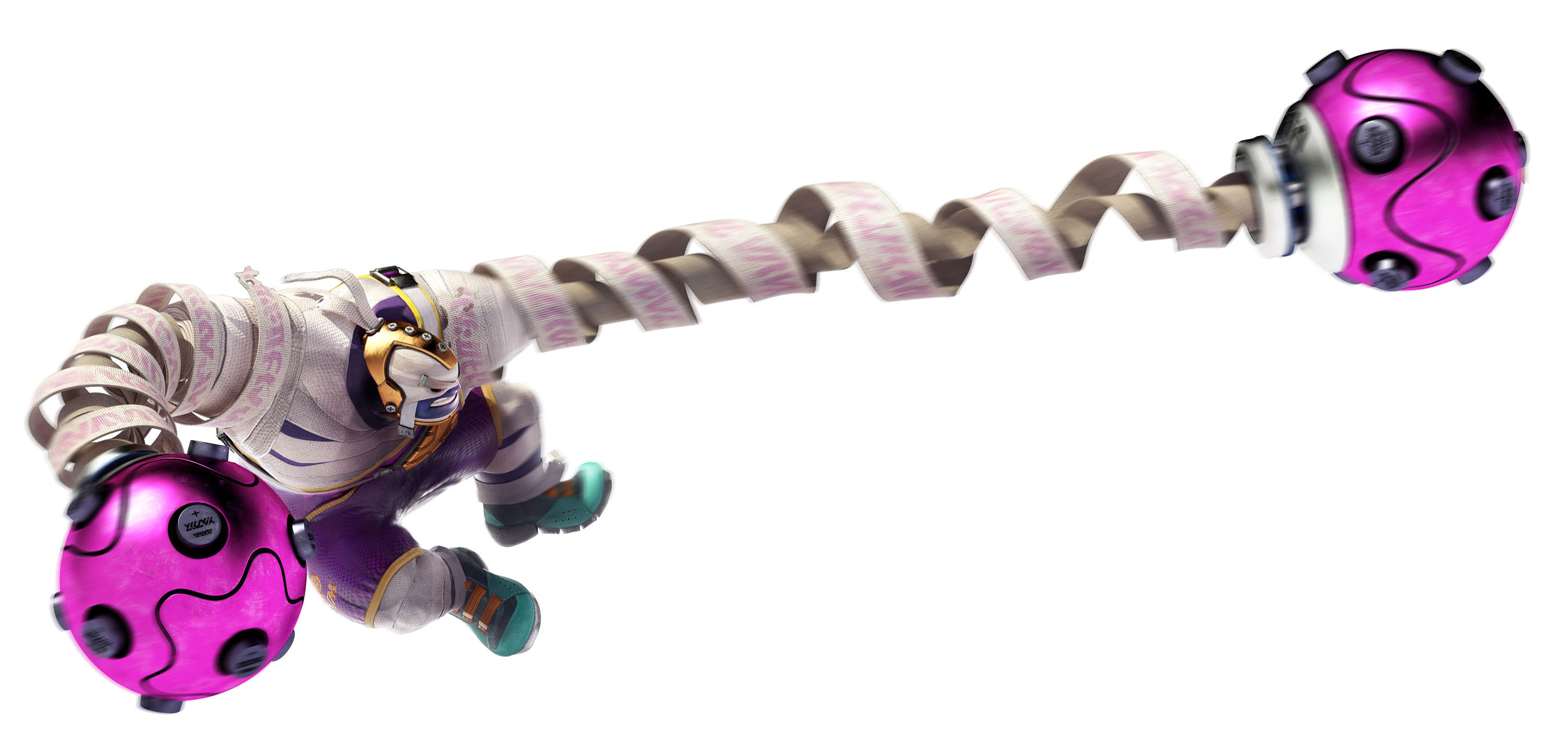 Sus habilidades especiales son estirar su cuerpo si dejamos pulsado el botón de saltar, y encogerlo si dejamos pulsado el de esquivar.
