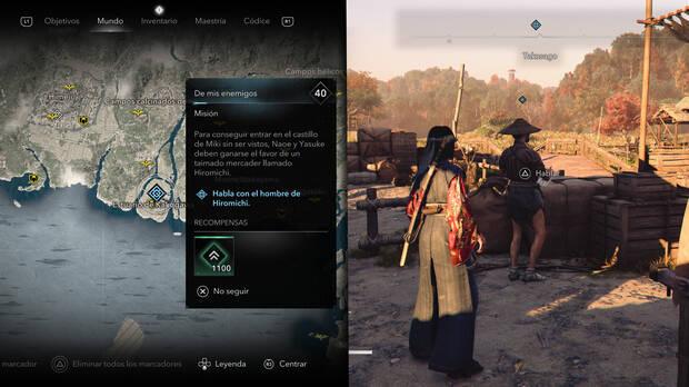 Para iniciar esta misión debes hablar con el ronin misterioso. Este personaje está al noroeste del castillo de Miki, al otro lado de los muelles de Miki, donde te señalamos aquí: