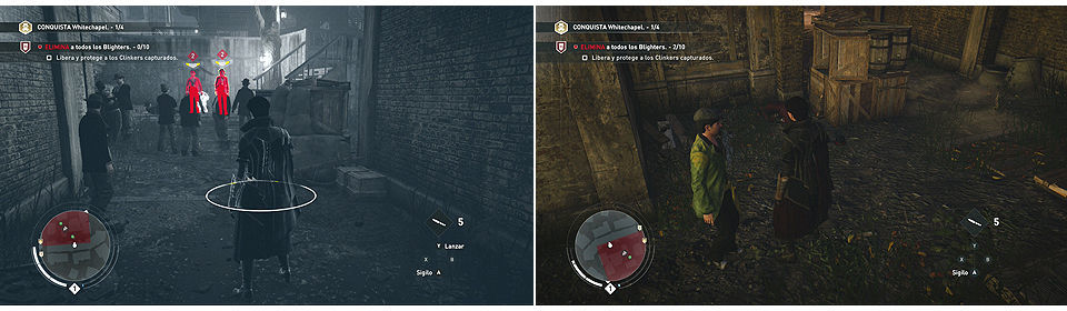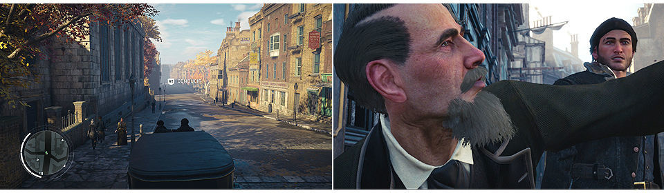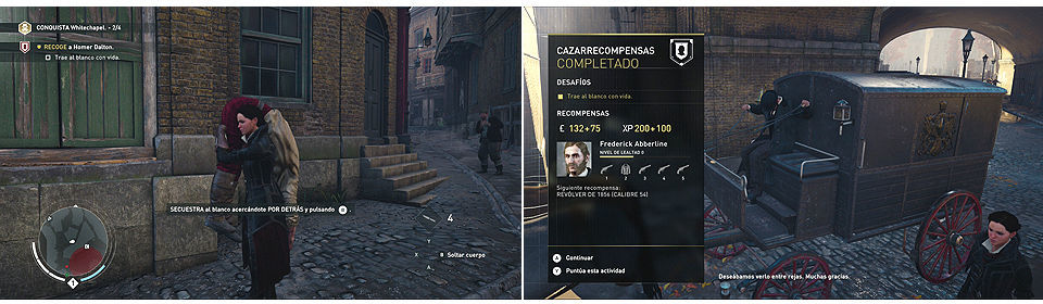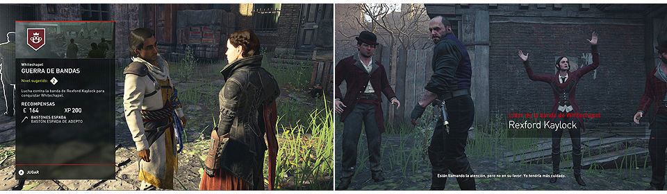 Tras encontrarnos con Green y hablar, hacemos la primera sincronización con una atalaya, realizamos un espectacular salto de fe y, tras seguir a Green durante un rato, al fin podemos controlar otra de las novedades de este nuevo Assassin: los carruajes. Tras esta sencilla misión se nos abre al fin el mapa de Whitechapel y podemos explorar las cuatro misiones secundarias que deberemos superar para entrar en nuestra primera guerra de bandas.