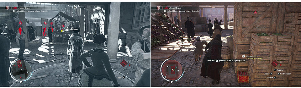 Nuestro objetivo es secuestrar a Homer Dalton, que comenzará a huir despavorido si ve que algo raro está ocurriendo. Para este objetivo en concreto la opción no es mala del todo, ya que está muy metido en las callejuelas de los Blighters y luego sacarlo de ahí nos llevará tiempo. Independientemente de que huya o no, tendremos probablemente varios enfrentamientos con los enemigos, así que además de secuestrar al objetivo quizás convenga noquearlo y llevarlo nosotros al carruaje. Luego tenemos que huir y llevarlo de vuelta con Abberline.