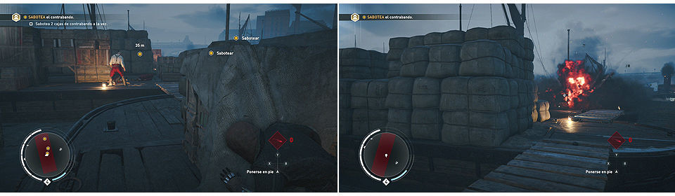 Para completar el desafío de sabotear 2 cajas a la vez, simplemente las 2 que estan más juntas tenemos que hacer una hilera de cajas de dinamita desde la pasarela hacia cada caja y luego encendemos la que hemos colocado en mitad de la pasarela, esto hará un efecto dominó y explotaran las 2 cajas a la vez (por la zona tenemos bastantes cajas para conseguirlo).
