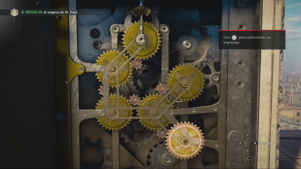 Nos dirigimos hacia la catedral de St. Paul, aquí podemos completar el primer desafío de saltar a un fardo de heno desde una tirolina, cuando lleguemos al punto indicado, en la base de la estatua podemos interactuar, se abre el panel y tenemos que resolver un puzzle.