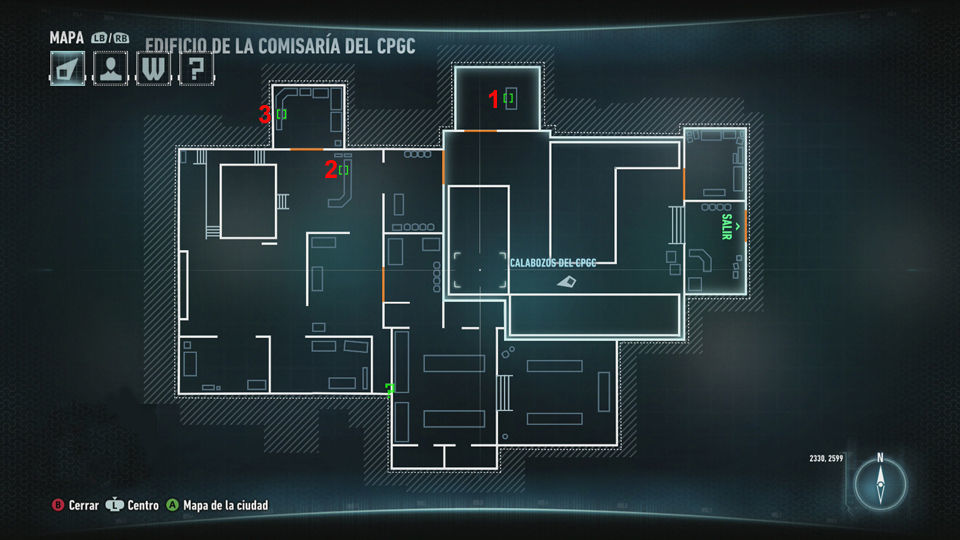 La sur es donde luchamos contra el Caballero de Arkham para salvar a Gordon y s eentra desde lo alto del edificio cogiendo el ascensor (2556, 1653).