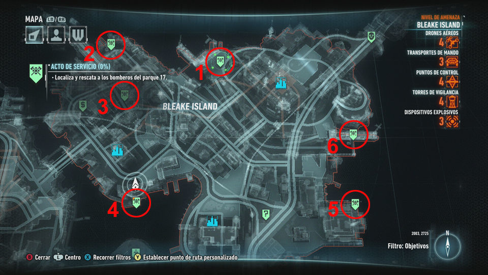 Esta misión secundaria nos la dan cuando pasamos por la comisaría por primera vez y hablamos con Gordon y Cash. En total son 15 bomberos más el Jefe, cada uno esta custodiado por diferente tipos de enemigos, hay que eliminarlos a todos para poder rescatarlos. Completando esta misión obtenemos 18 puntos de mejora.