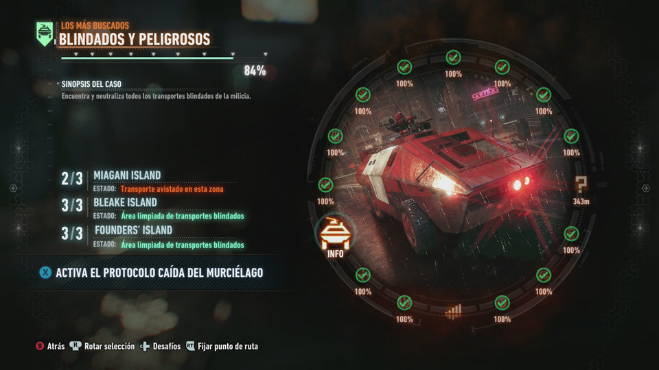 Esta misión es bastante sencilla, no tiene ubicaciones en el mapa, simplemente hay que poner el cursor sobre la misión en la rueda de las misiones Most Wanted y Alfred nos dará la ubicación de un vehículo, en total son 9, 3 en cada isla.