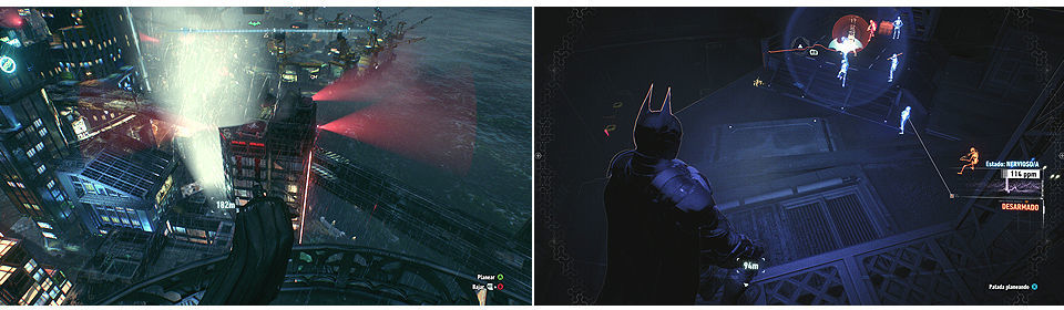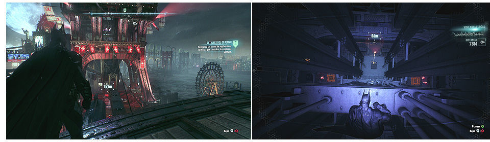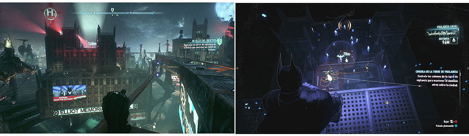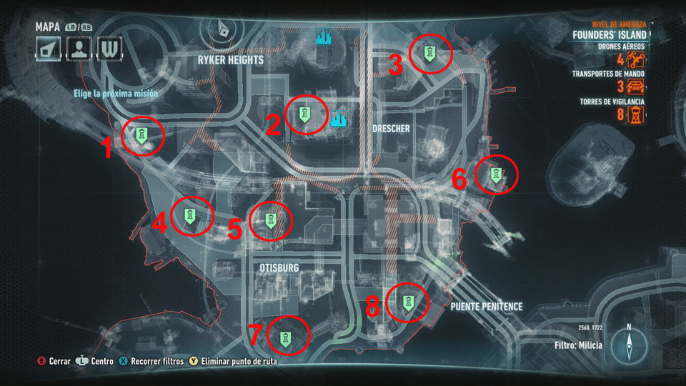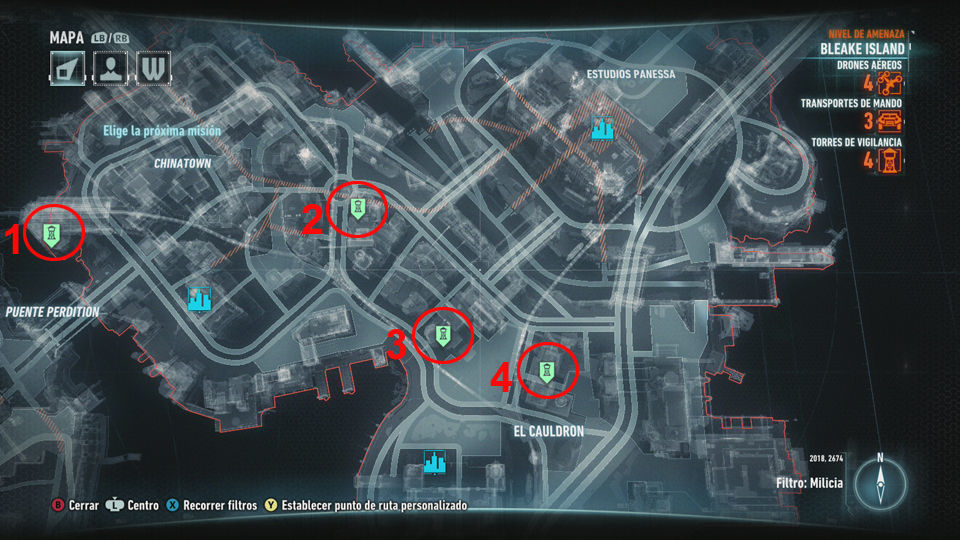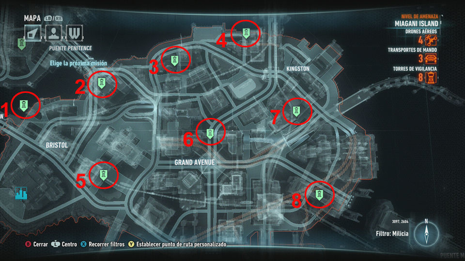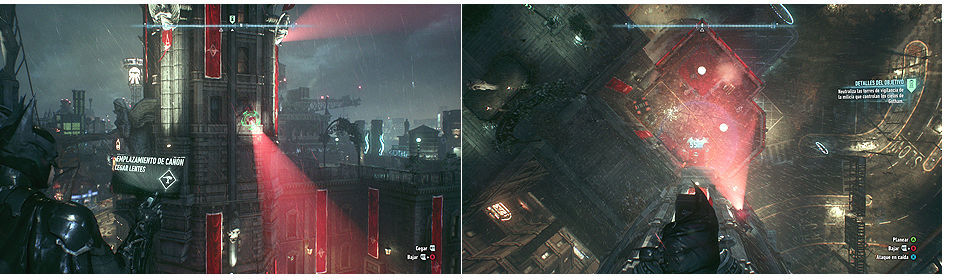 Neutraliza las torres de vigilancia de la milicia que controlan los cielos de Gotham. Al completar esta misión obtenemos 23 puntos de mejora. Esta misión nos la dan tras bajar los punetes de Miagani, cuando tenemos que ir a Grand Avenue. La milicia ha colocado puntos de control por las alturas de Gotham, todos tienen un terminal (o 2, muy pocos) y hay que eliminar a los enemigos y luego destruirlo.
