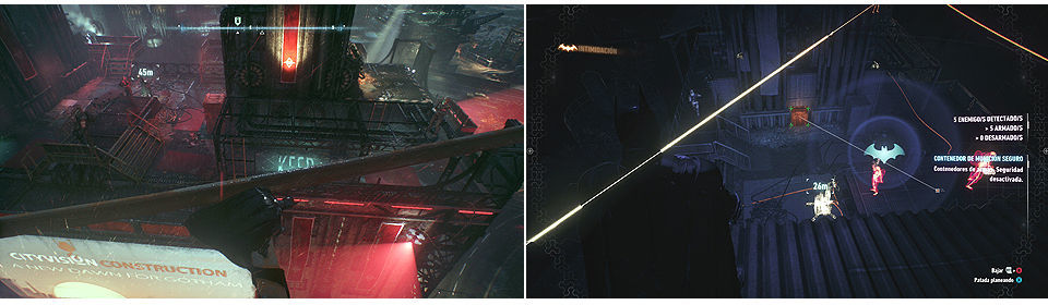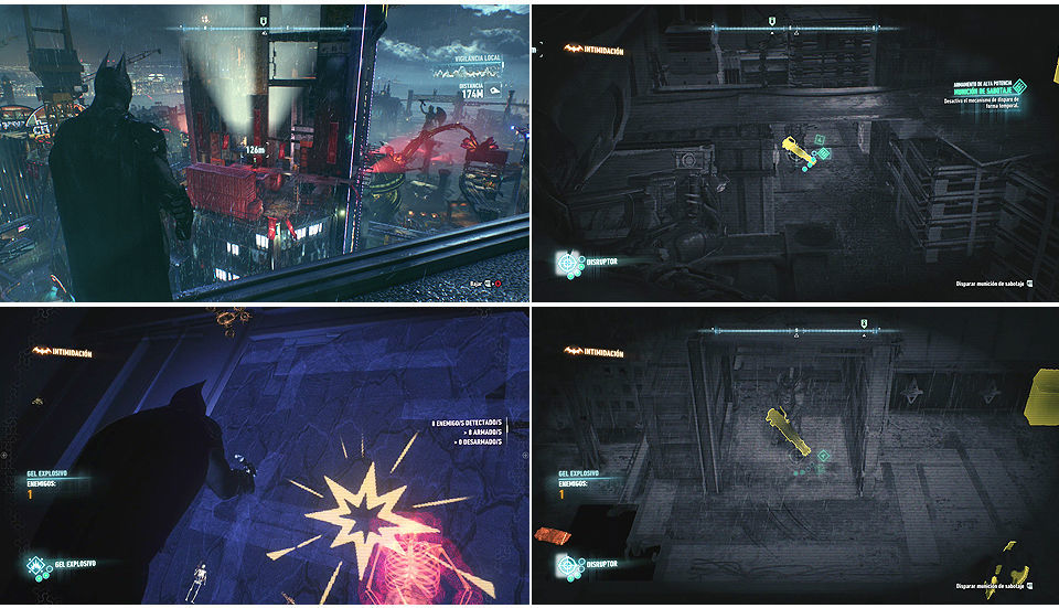 Este punto de control tiene 7 enemigos, todos armados, eso sí tenemos suficientes recovecos para eliminarlos con más calma con eliminaciones silenciosas y hay 2 cuerdas para atacar desde arriba y hacer eliminaciones múltiples, uno de los enemigos es un médico y otro tiene escáner del modo detective, Disruptor sobre ellos.