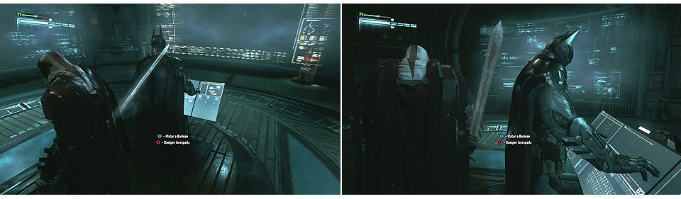 Una vez lo hagamos, Azrael aparecerá ante Batman y Bruce le da a elegir, seguir su propio camino o seguir siendo un títere de la orden de San Dumas. Hay que coger la espada que hay cerca de la entrada y decidir si matar a Batman o romper la espada, si decidimos romperla, Batman y Azrael se despedirán, si decidimos atacar a Batman, este esquiva el ataque y Azrael acaba en los calabozos de la comisaría.
