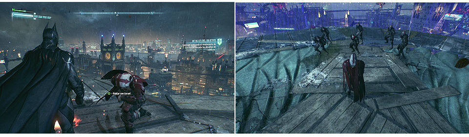 Esta vez le encontramos en lo alto de la Estatua de Gotham, ahora hay que luchar contra 6 enemigos con katana, cuidado con sus saltos y sus ataques imbloqueables, cuando les derrotemos Alfred nos revelará información.