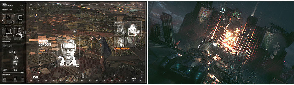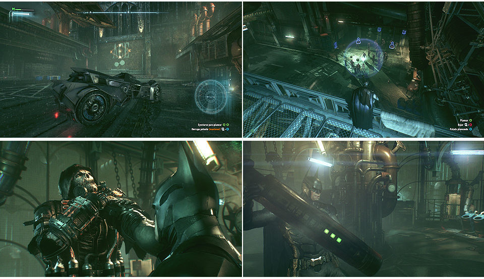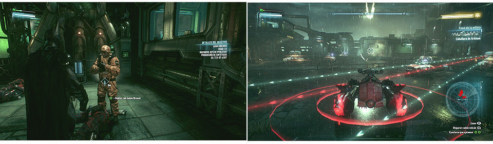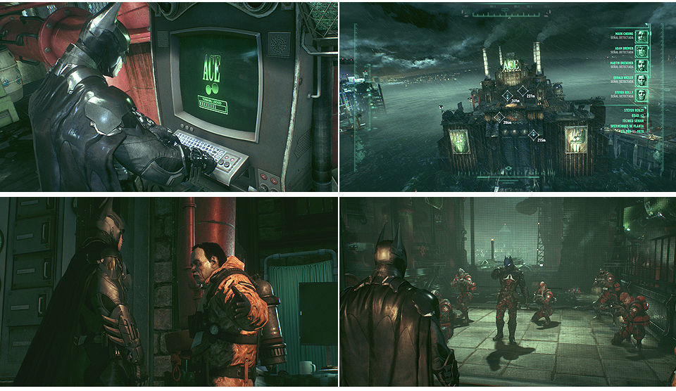Debemos usar el terminal (abajo a la izquierda) para dar con las identificaciones de los trabajadores, usando el modo detective identificaremos fácilmente los blancos para librarnos de ellos, junto al terminal hay dos soldados que podemos eliminar fácilmente metiéndonos por los conductos del suelo, una vez que escaneemos el terminal hay que dirigirse al punto más alto de la estructura para determinar la ubicación de los trabajadores. Usando el Batarang hay que localizar la posición de 5 trabajadores