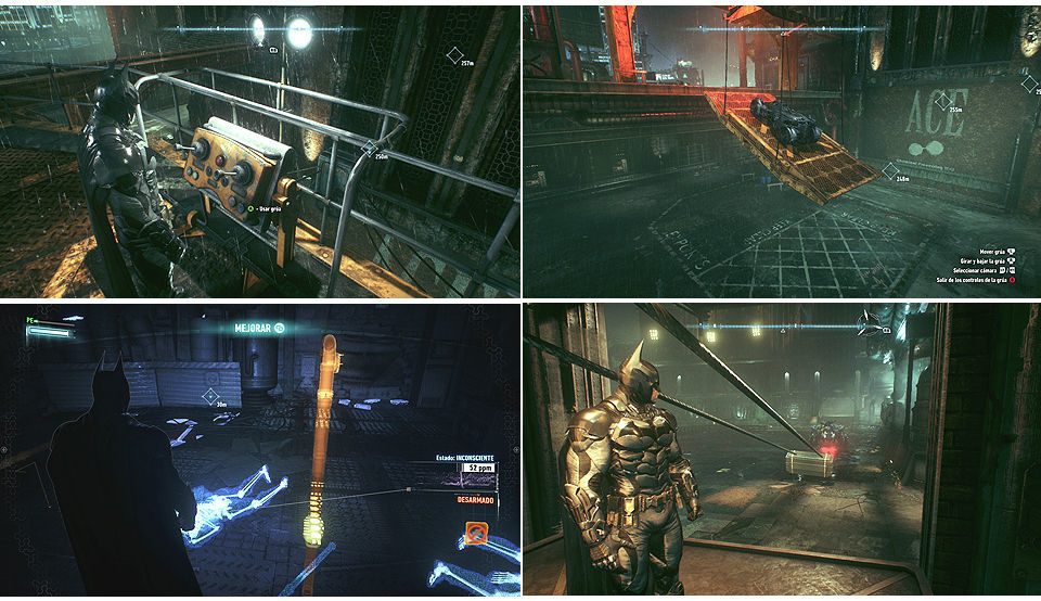 Bien una vez dejemos a Adam con Gordon debemos volver a entrar a detener al Espantapájaros, Oráculo nos informa que la puerta esta cerrada a cal y canto, usamos el cañón del Batmóvil sobre el logo de ACE para abrir un boquete y usando nuevamente la grúa cruzamos con el Batmóvil (si no vamos con el coche no podemos avanzar) eliminamos a los drones hasta llegar a una zona donde 2 guardias patrullan junto a una torreta, aquí hay que usar los conductos de los lados para aparecer por debajo de los soldados con Intimidación y eliminarlos antes de que la torreta nos detecte, usamos el panel para abrir la puerta y que pueda pasar el Batmóvil, nos encontramos a un buen grupo de matones, igual los eliminamos y abrimos la puerta al coche.