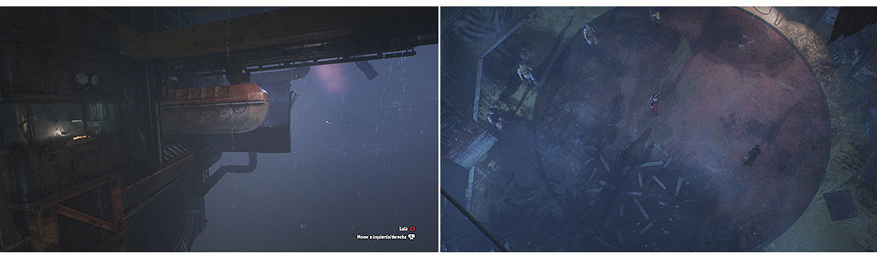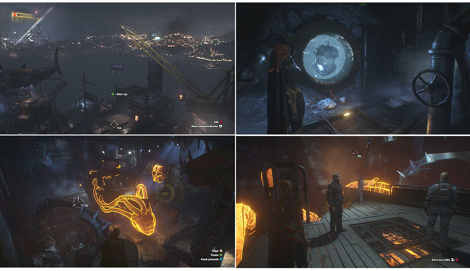 Nos separamos de Robin tras la explosión, ahora hay que llegar hasta lo alto de la plataforma petrolífera. Subimos con la pistola ancla hasta un mecanismo para mover la grúa y poder anclarnos arriba, pasamos por el conducto y llegamos a una sala donde hay varios matones, usando el dispositivo de pirateo los confundimos para poder atacarles por sorpresa, desbloqueamos la puerta con la Clave "Riqueza". Continuamos subiendo, usamos la Batgarra para acceder al conducto y llegamos a otra sala donde 3 matones custodian a otro rehén, usamos el dispositivo de pirateo para despistarlos y liberarle, seguimos ascendiendo hasta llegar a lo alto y ver el parque por completo.