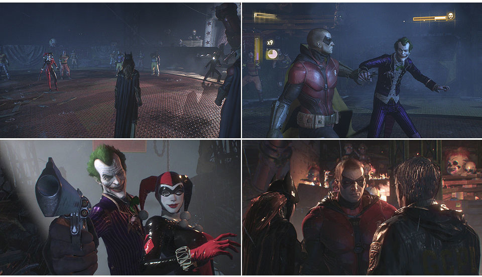 Cuidado en este combate, Joker va armado con un cuchillo y Harley con un Bate (sus ataques son imbloqueables) además el Joker puede tirar bombas de gas de la risa que nos dejara aturdido para que Harley nos ataque por la espalda con su bate (hay que pulsar LB/L1 para que el compañero nos libre) e igualmente el Joker cuando nos hace contras hay que pulsar el botón continuamente para golpearle y evitar su cuchillo, después evitar su disparo también con LB/L1, cuando les quitemos toda la barra de salud, saltará la secuencia final del capítulo.