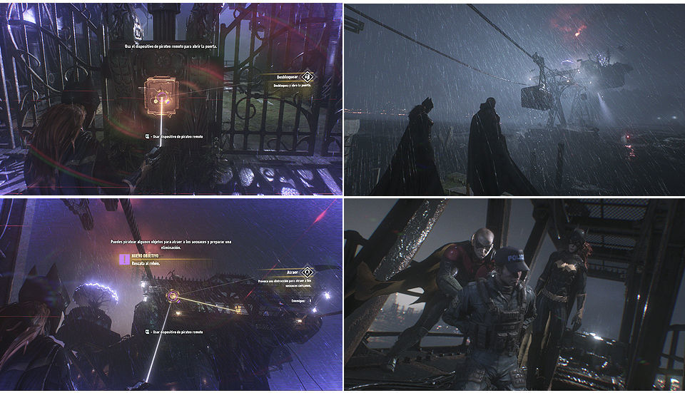 Ahora tenemos que avanzar hasta el parque usando la pistola ancla para movernos por el teleférico, cuidado con el francotirador dentro de uno de las cabinas, con el dispositivo de pirateo remoto podemos electrocutarle, avanzando vemos a un rehén con 3 matones del Joker, usamos nuevamente el dispositivo para distraerles y atacar a al vez con Robin , en este momento el Joker dispara un misilazo a nuestra posición.