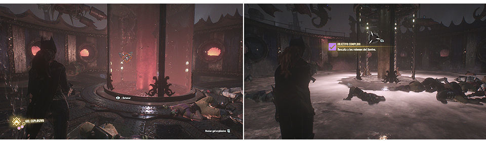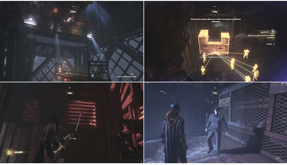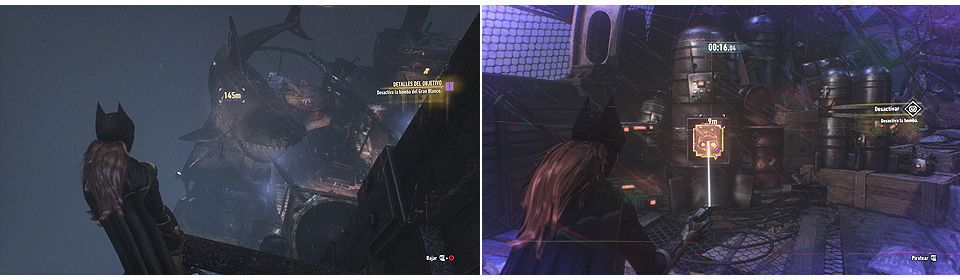 Desde lo alto lanzamos el Batarang para localizar a los rehenes (como al comienzo del juego con Batman en Ace Chemicals) localizamos 3 posiciones con rehenes, nos ponemos manos a la obra para liberarlos, cada vez que liberemos unazona tenemos que detonar una bomba, que se indican abajo, en total son 2.