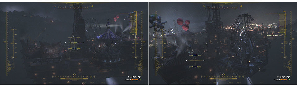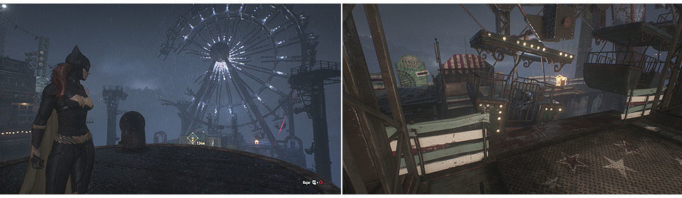 Al sur encontramos la Noria, cuidado con los francotiradores apostados en la torres delanteras, además tenemos varios matones patrullando. Cuando eliminemos a todos, vamos hasta el control para intentar pararla, pero en vez de pararse viene otro grupo de matones del Joker, podemos usar varias trampas con el dispositivo de pirateo remoto para distraerlos, la zona igualmente tiene conductos y rejillas, tras eliminar al segundo grupo pirateamos el panel y girando la Noria con el Stick izquierdo hacemos que bajen los rehenes.