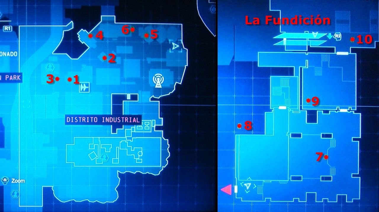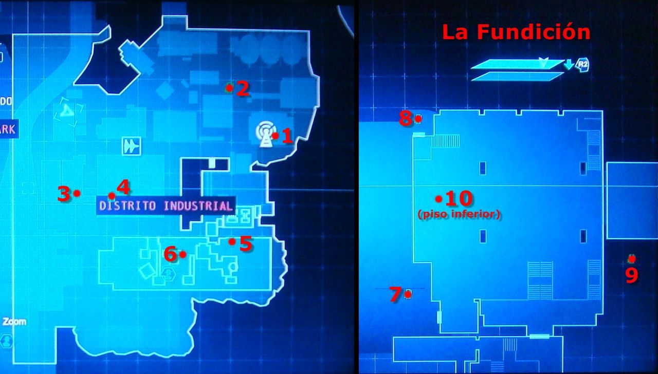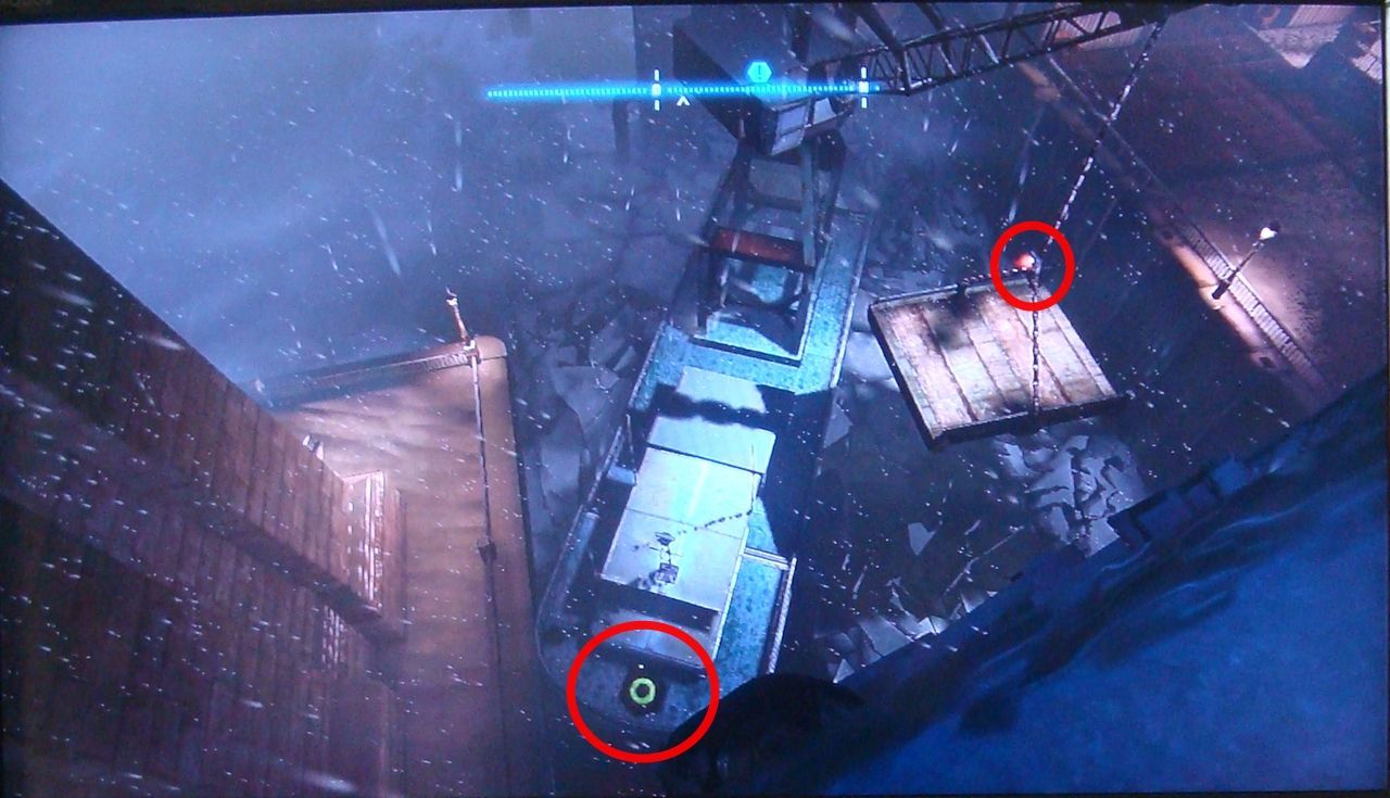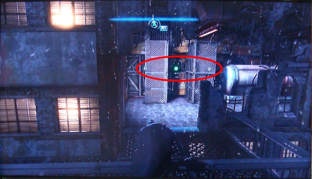 #9-8. (Dentro de la Fundición) Ve hacia la puerta del noroeste del almacén. Está cerrada, pero la pared de al lado es endeble. Llega hasta ella creando una tirolina con el garfio teledirigido en el anclaje de encima, de manera que puedas bajar colgado y romperla de una patada.