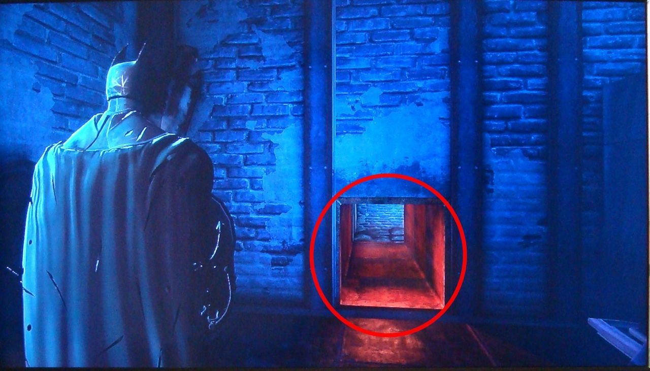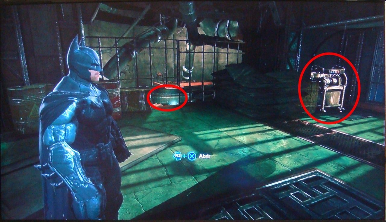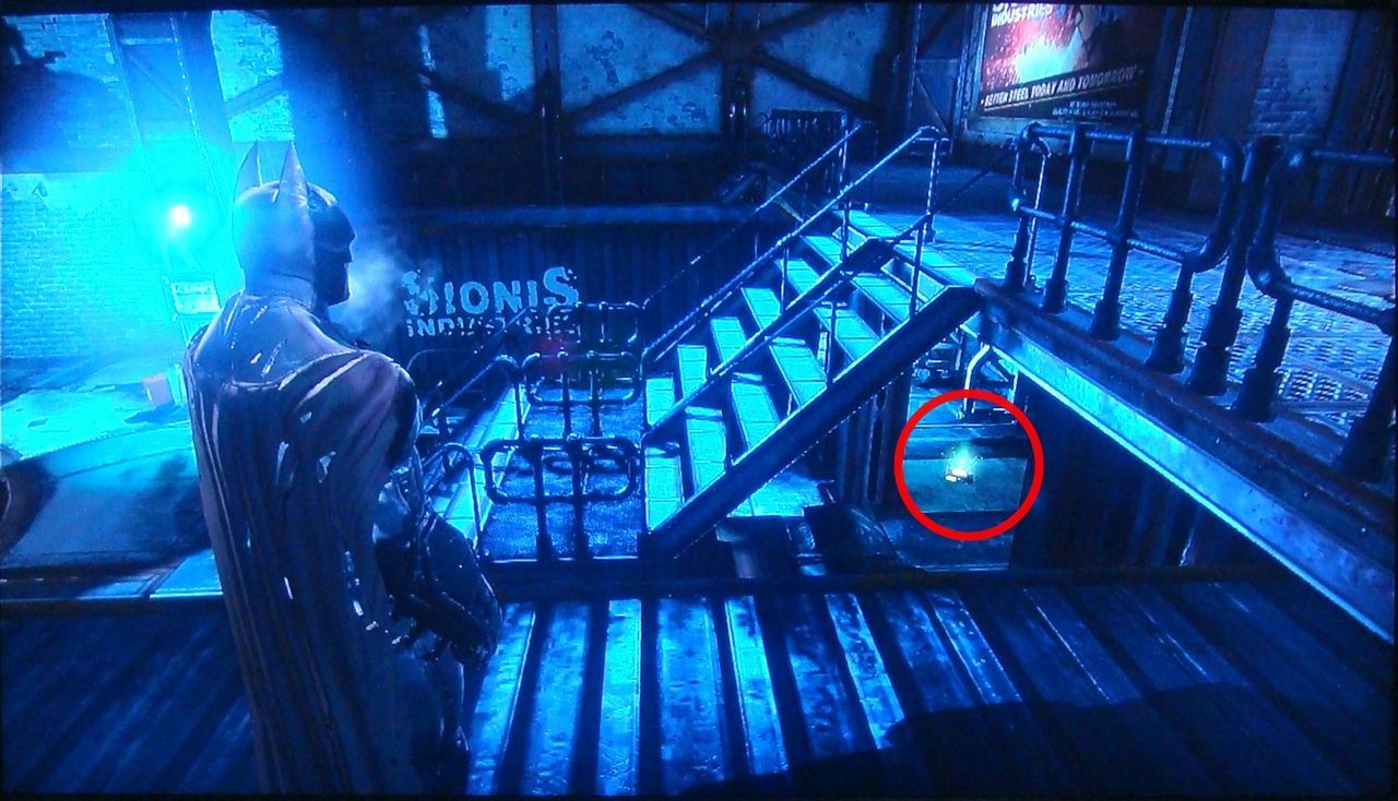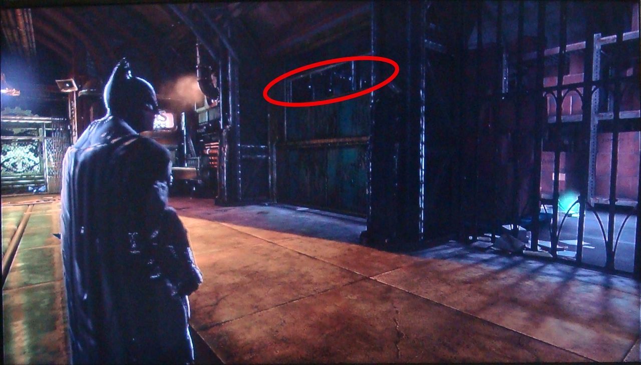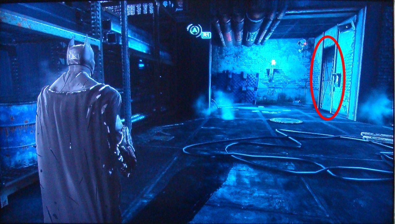 #9-9. (Dentro de la Fundición) Pasa a la sala oculta por el agujero en la pared este del almacén. Justo a tu derecha puedes lanzar un batarang remoto para hacerlo pasar por la rendija superior de la compuerta. Haz que gire e impacte contra el interruptor de la pared, así podrás deslizarte por debajo.