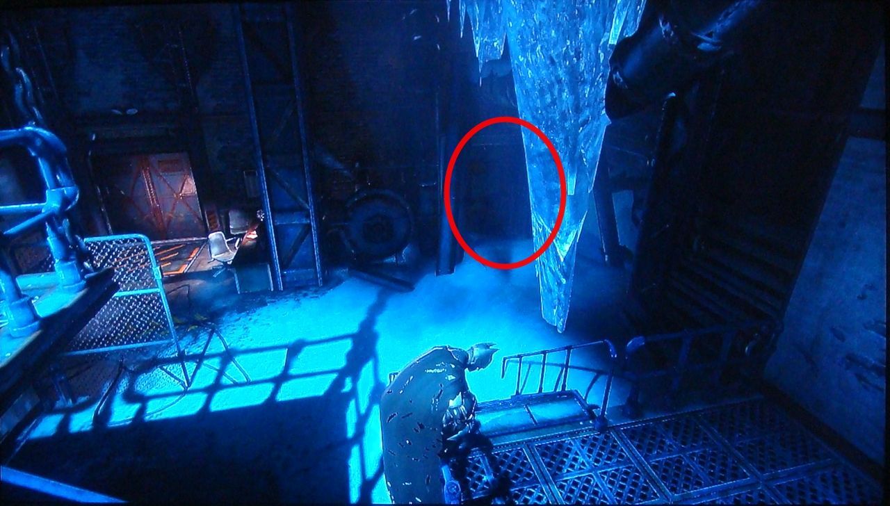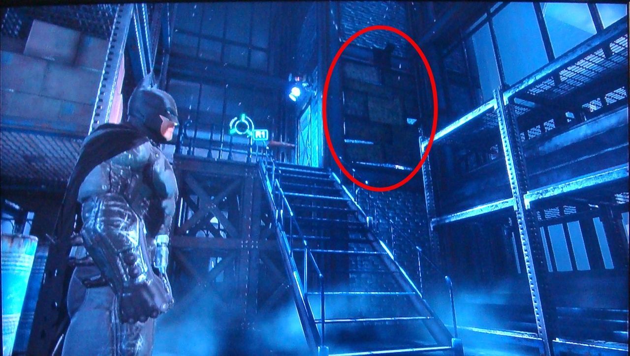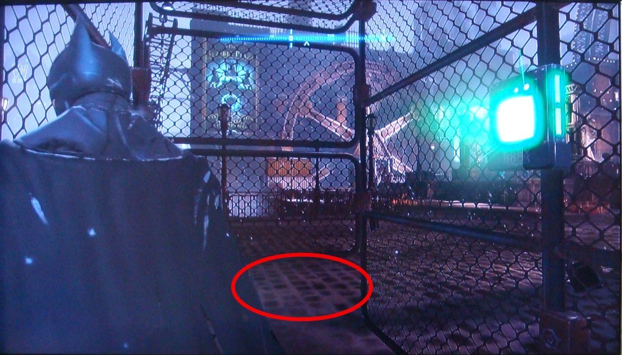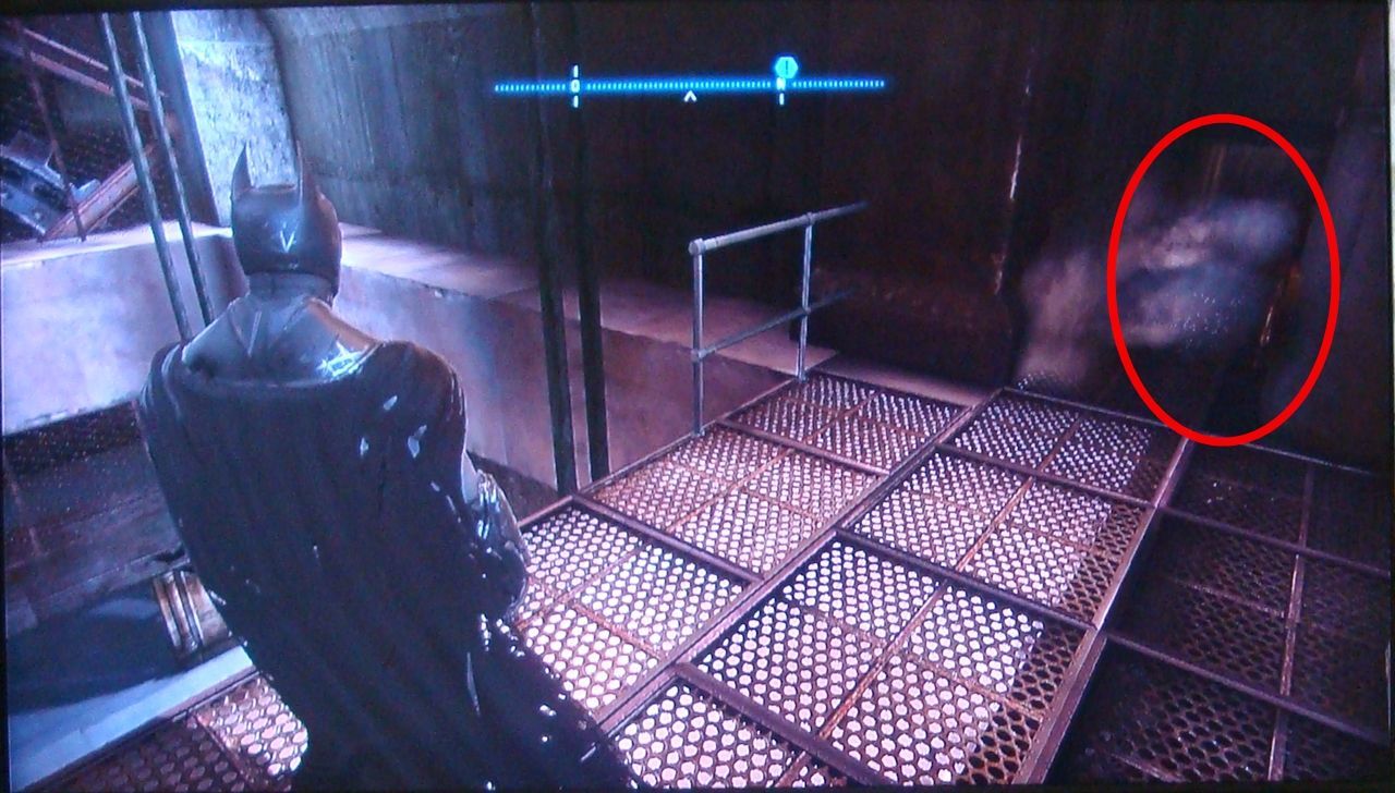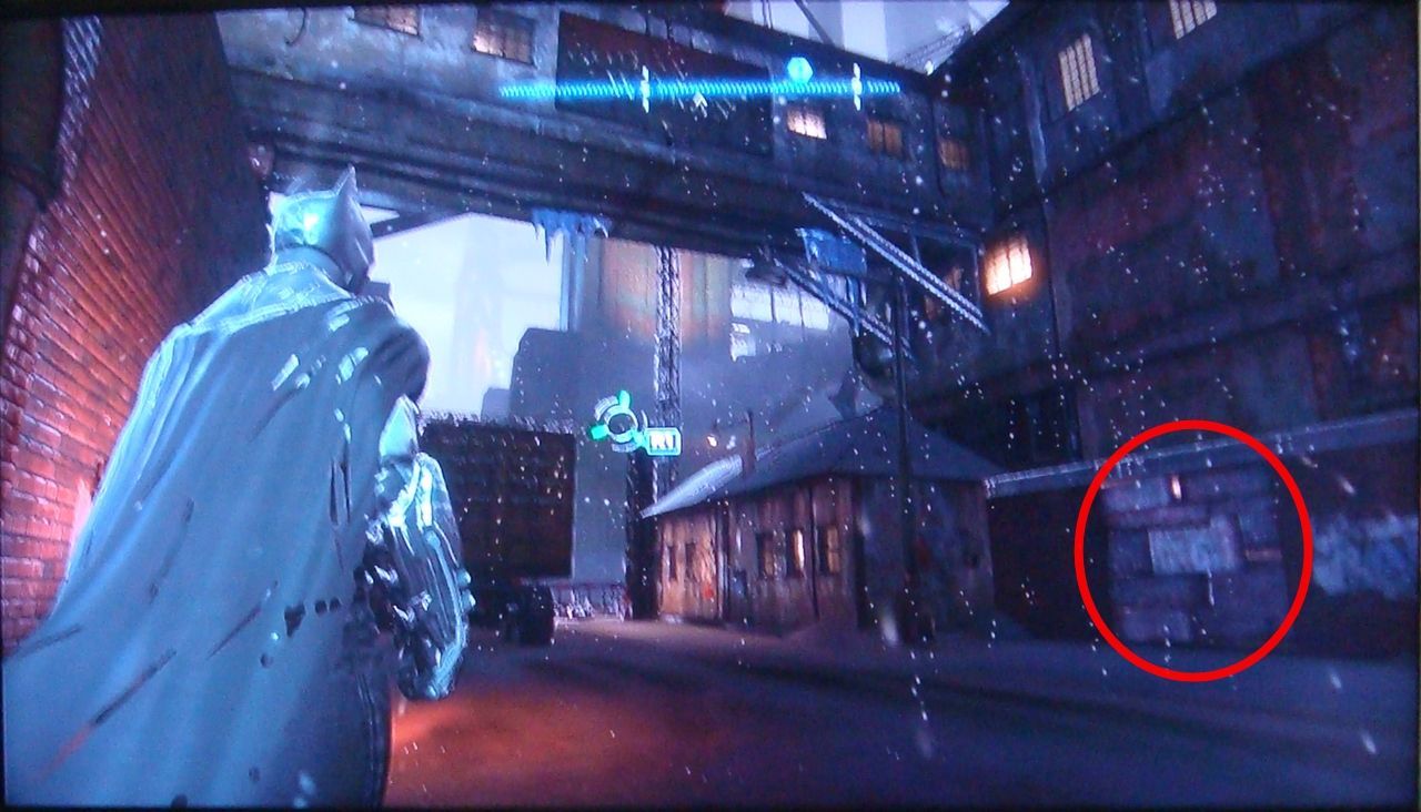 #9-9. (Dentro de la Fundición) Pasa a la sala oculta por el agujero en la pared este del almacén. Justo a tu derecha puedes lanzar un batarang remoto para hacerlo pasar por la rendija superior de la compuerta. Haz que gire e impacte contra el interruptor de la pared, así podrás deslizarte por debajo.