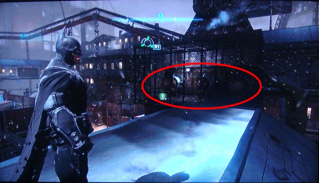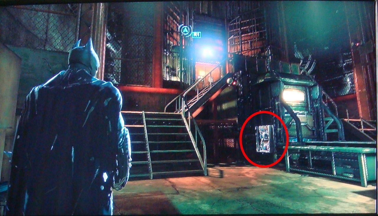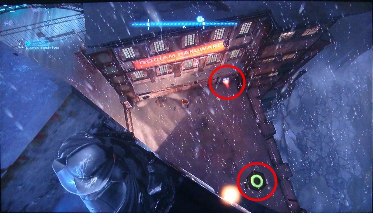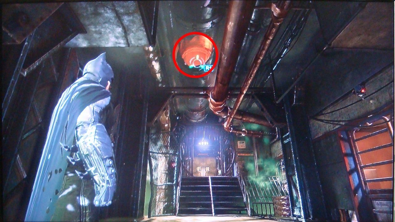 #10-10. (Dentro de la Fundición) Con los guantes elétricos, carga el generador que hay en la sala inferior del lado sureste del laboratorio de drogas. Esto hará que un mecanismo se mueva y deje visible el paquete de datos, alcanzable con la batgarra.