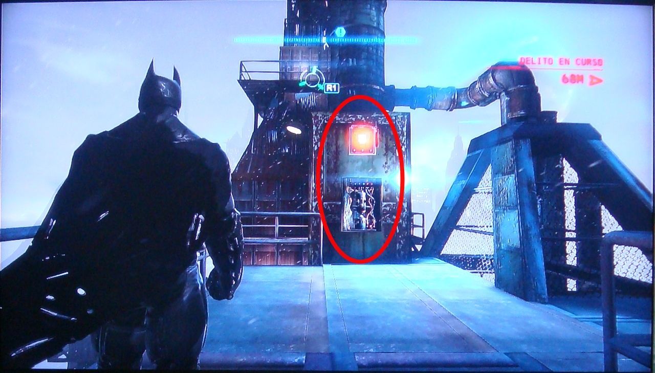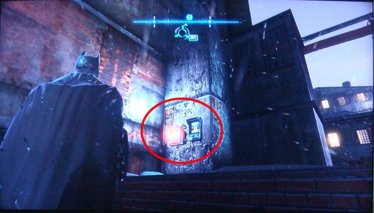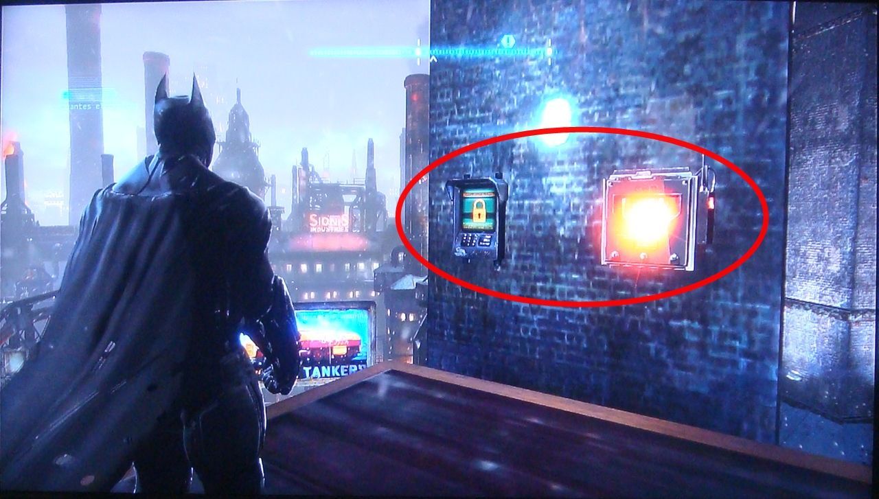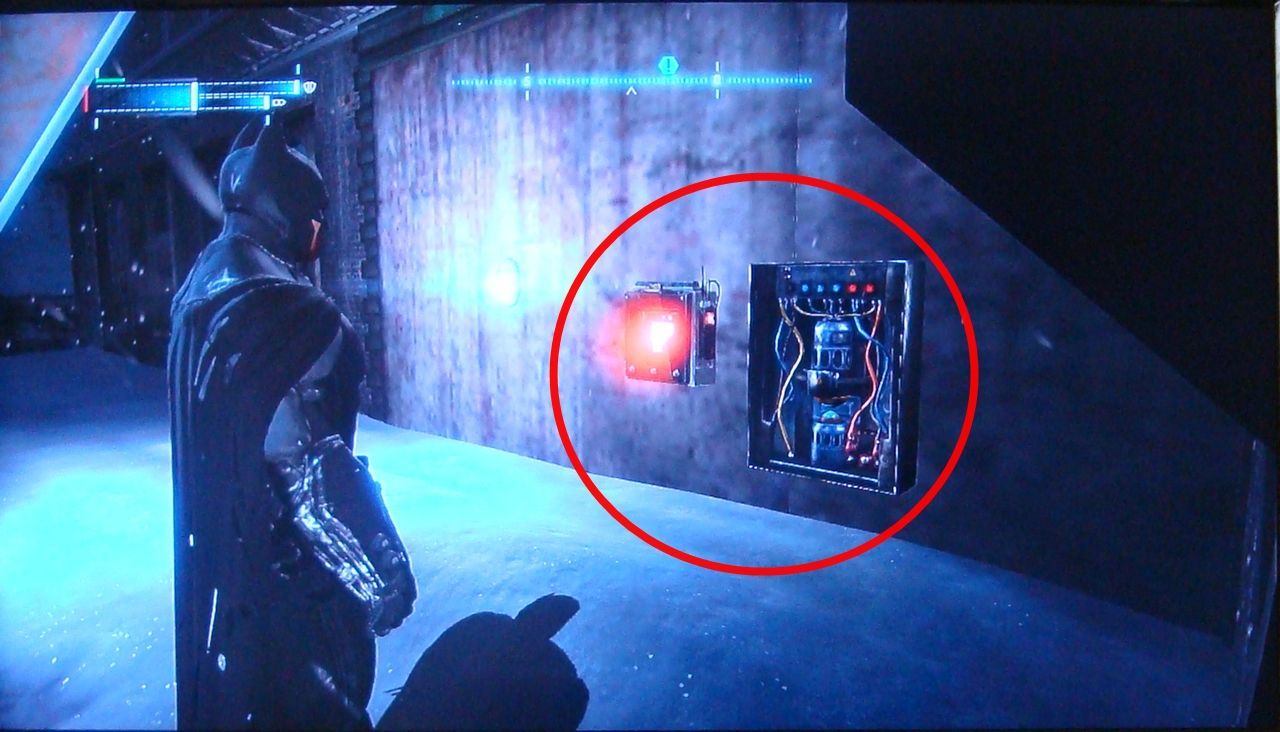 #8-6. Pon gel explosivo sobre el interruptor de la izquierda y luego pisa la base. Haz detonar el gel explosivo y lanza un batarang remoto para que entre por la pequeña rendija que acabas de abrir, haciendo que impacte contra el interruptor iluminado. Sin moverte del sitio, saca la batgarra y coge el paquete de datos.
