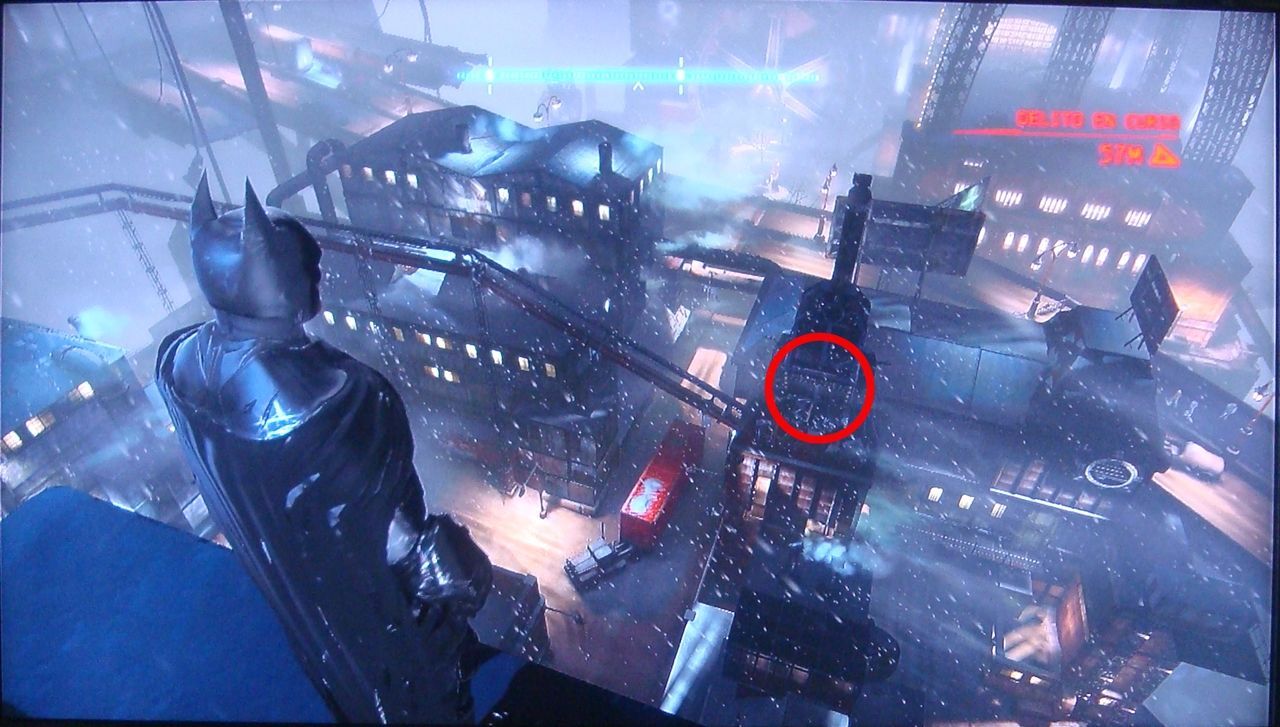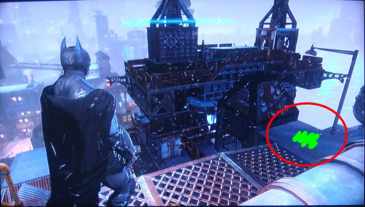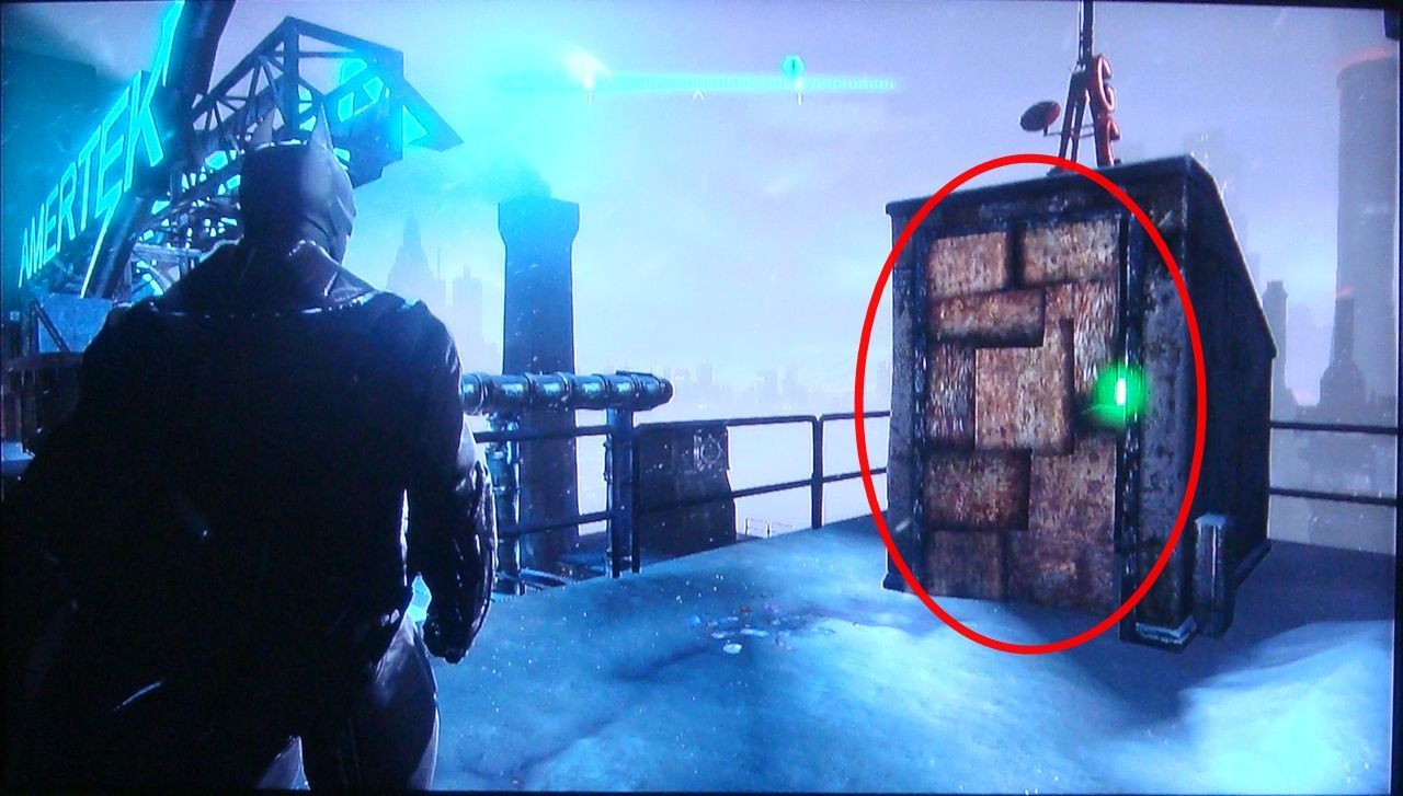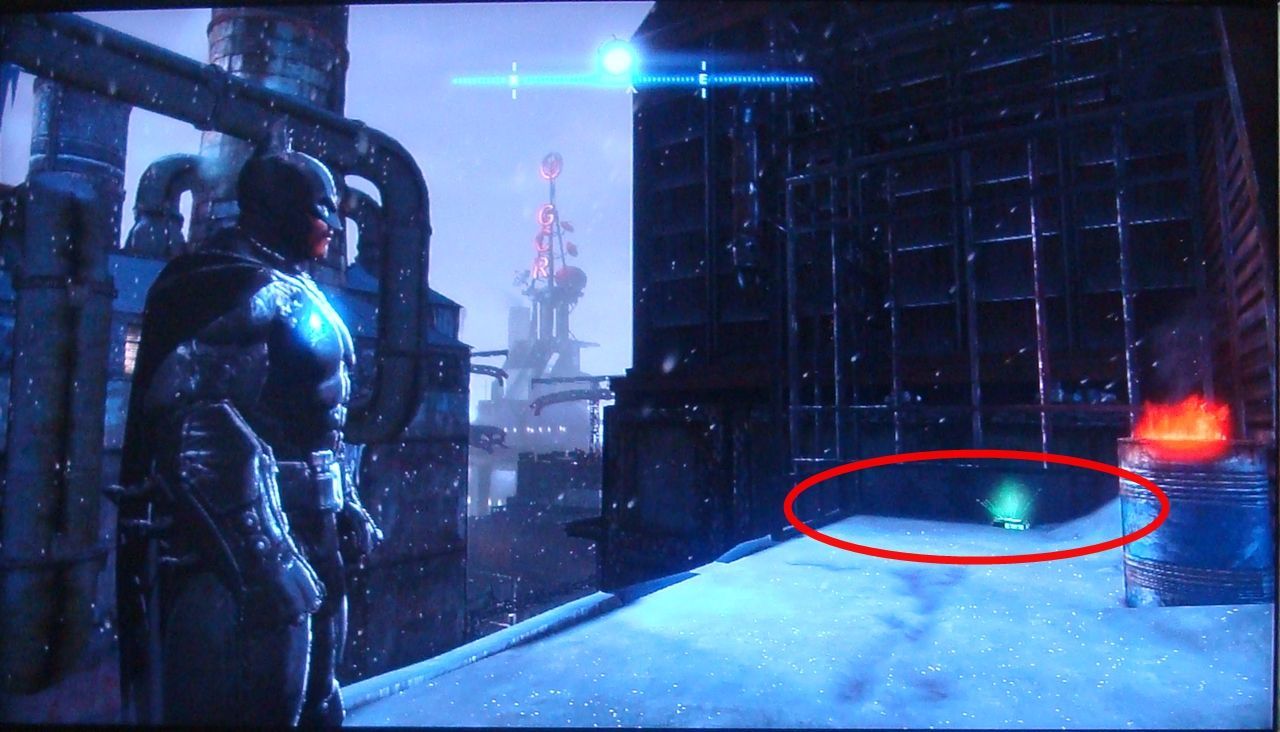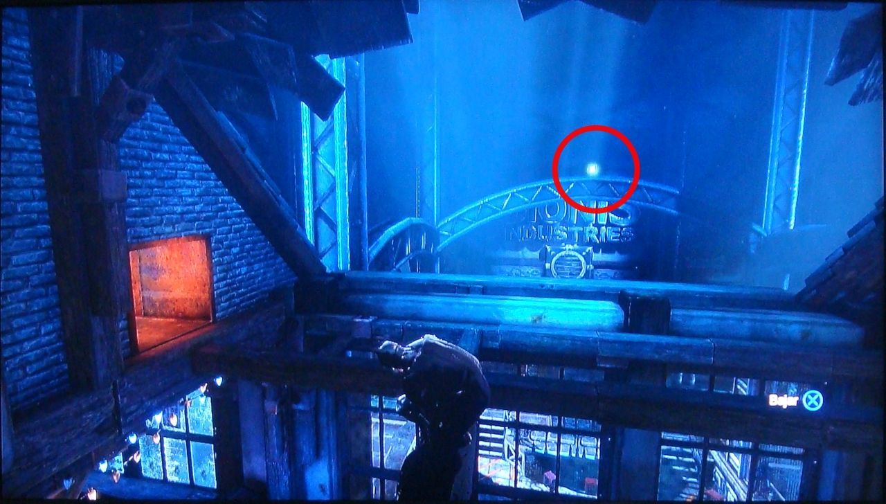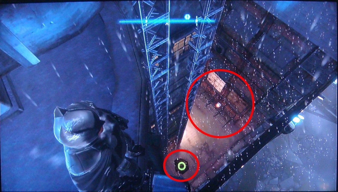 #8-7. (Dentro de la Fundición) Desde las vigas superiores de la oficina de Sionis, asómate hacia el muelle de carga y coge el paquete de datos con la batgarra.