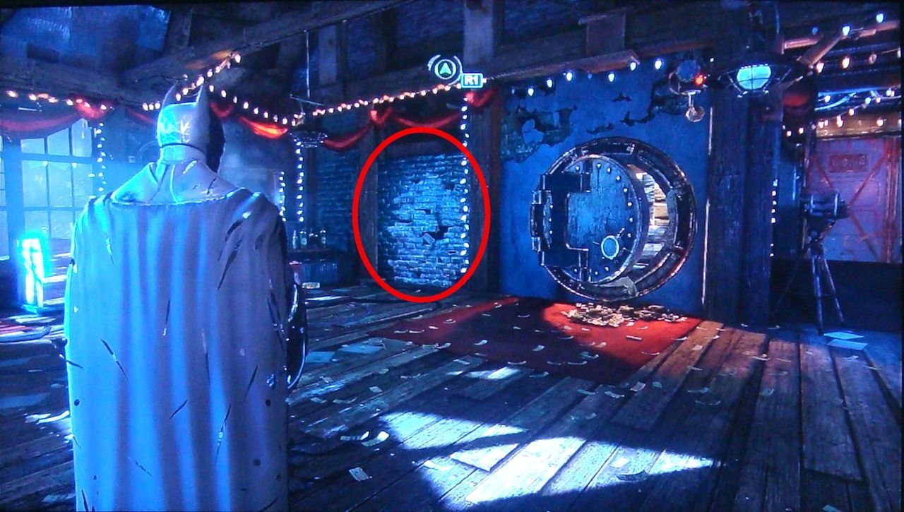 #8-8. (Dentro de la Fundición) Pon gel explosivo en la pared endeble, junto a la caja fuerte en la oficina de Sionis, y hazla detonar.