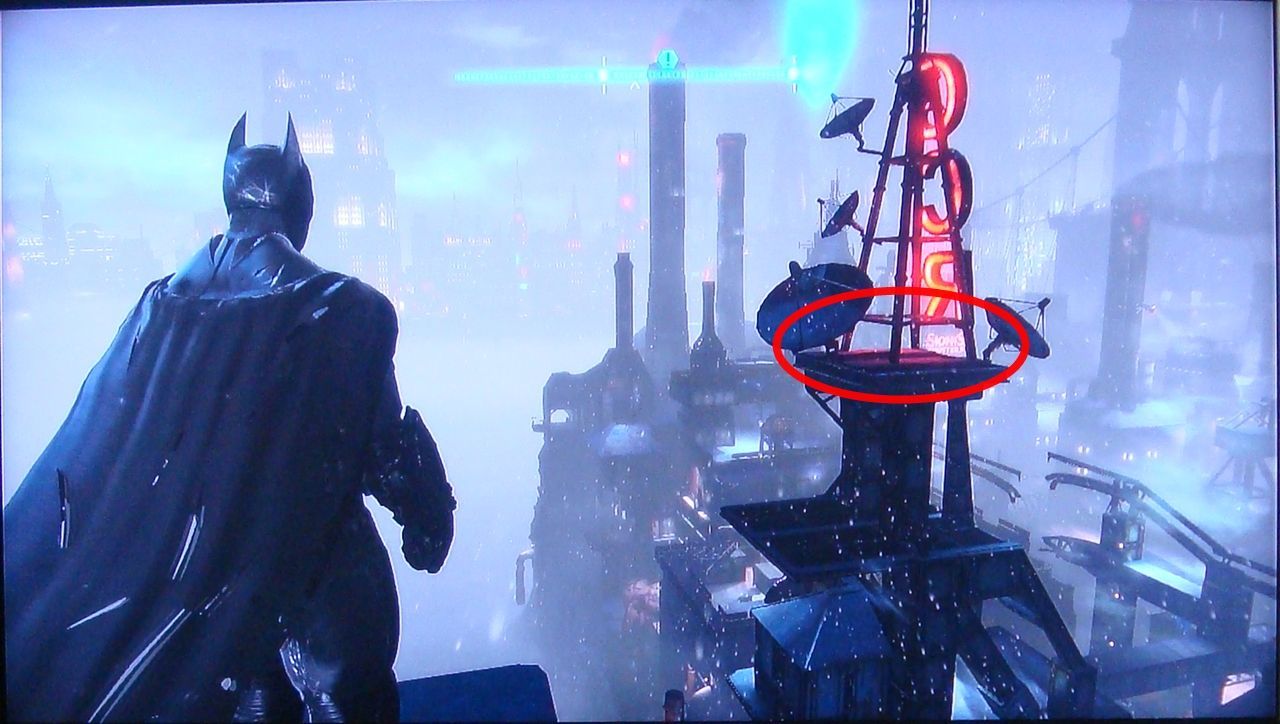 #10-2. Ponte en la base frente al edificio y activarás una cuenta atrás de 15 segundos. Es el tiempo que tienes para disparar un batarang a cada uno de los tres interruptores que se han iluminado en la fachada. Después recoge el paquete de datos con la batgarra.