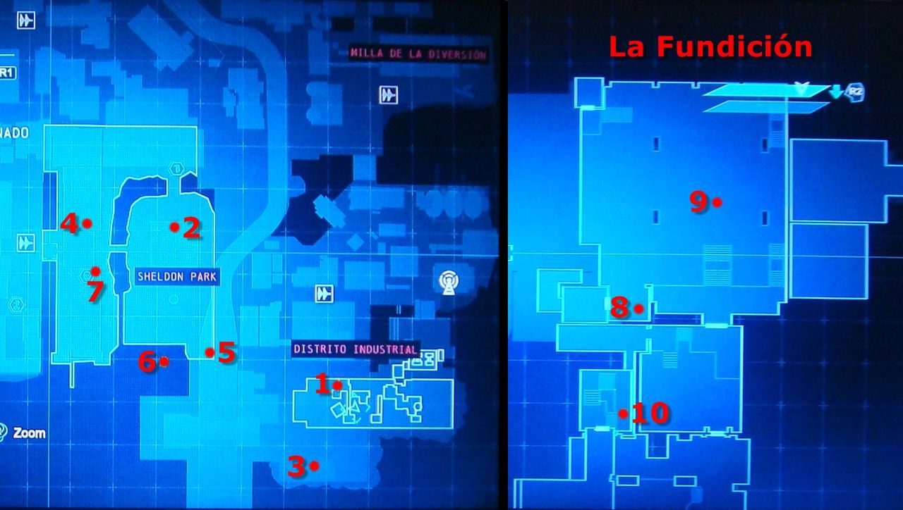 #9-10. (Dentro de la Fundición) Coge el ascensor para ir hasta el laboratorio de drogas. Al bajar las escaleras de la derecha encontrarás un generador. Cárgalo con los guantes eléctricos y coge el paquete de datos con la batgarra, en la cinta transportadora de al lado.