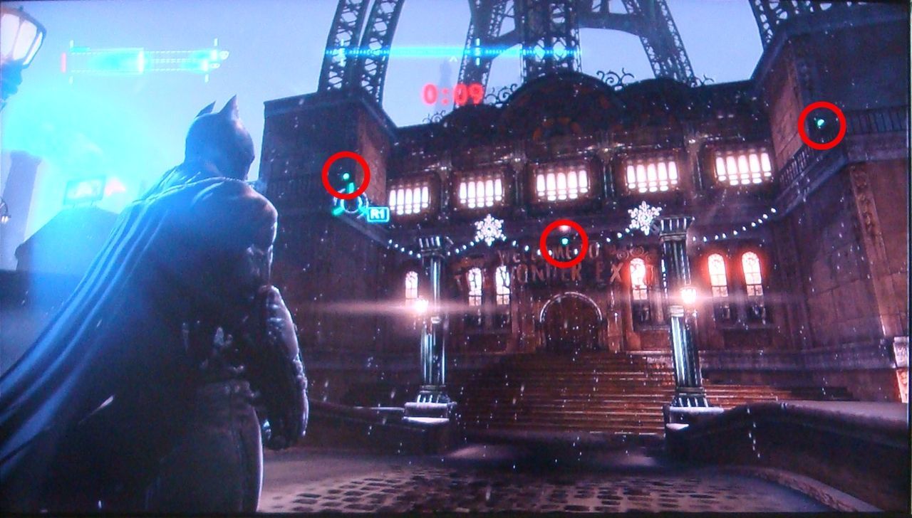 #10-3. Hay tres interruptores en la pared y tienes 9 segundos para darle con tu batarang a los tres desde el momento en que golpees el primero. Deberías tener tiempo de sobras.