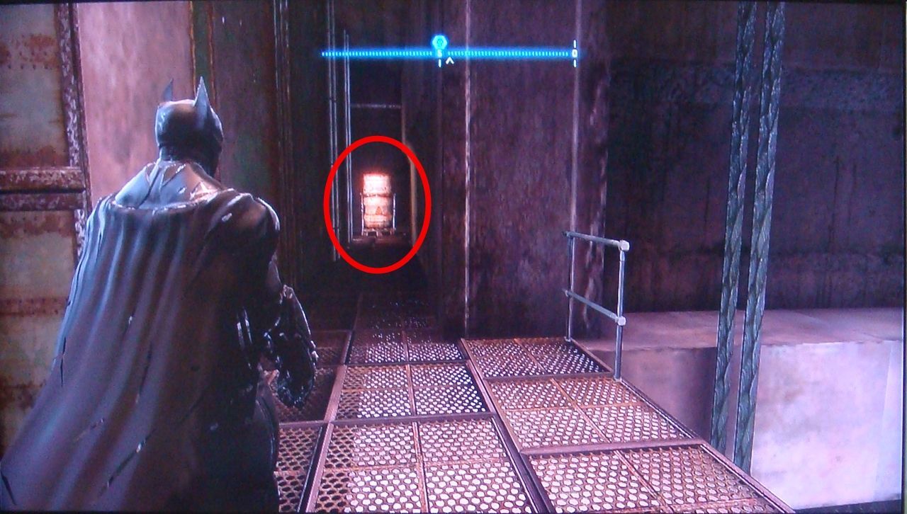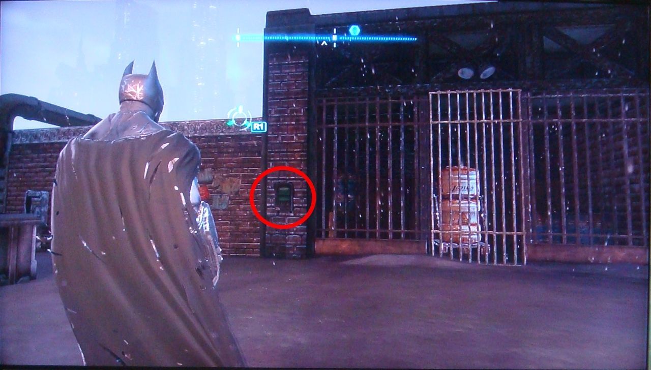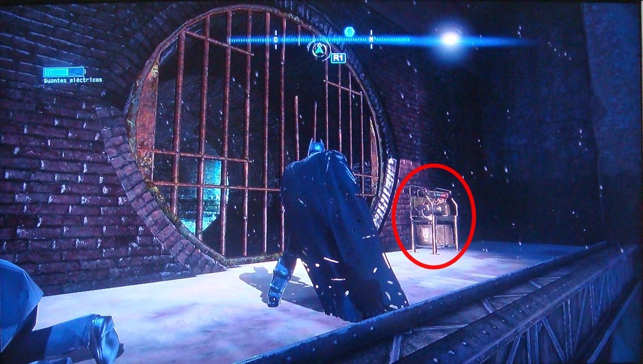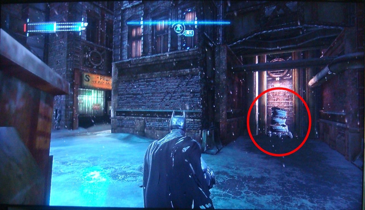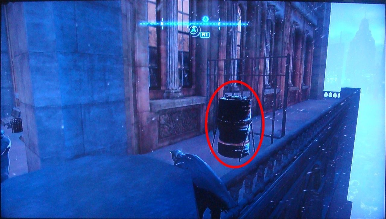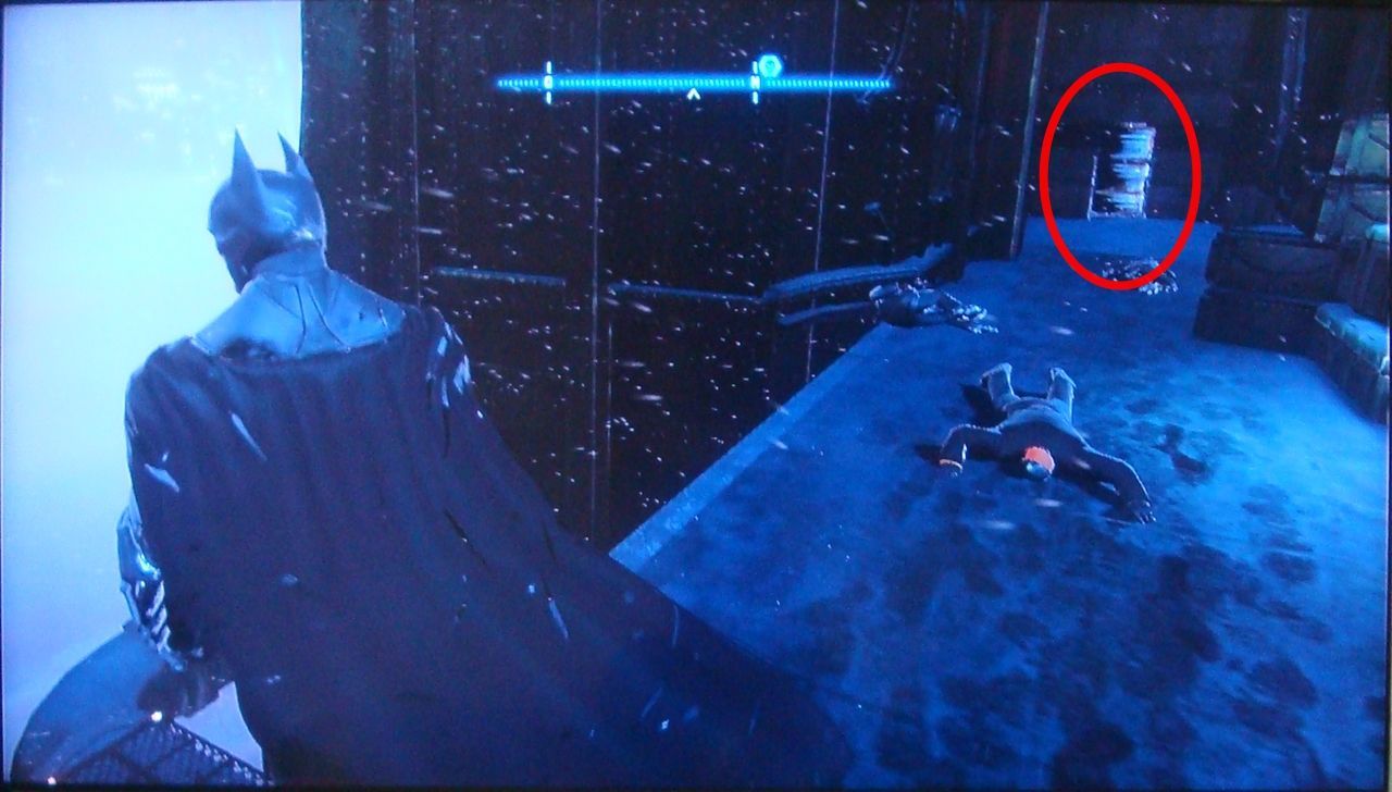3. En el lateral de Pioneers Bridge de Gotham. Sitúate al suroeste, sobre las placas de hielo del río, en la esquina con el edificio central, para llegar fácilmente con la batgarra. Acaba con los hombres de Máscara Negra y haz estallar el bidón.