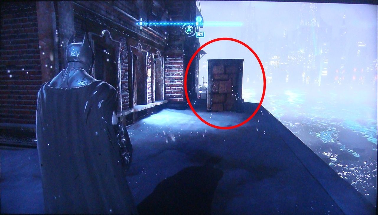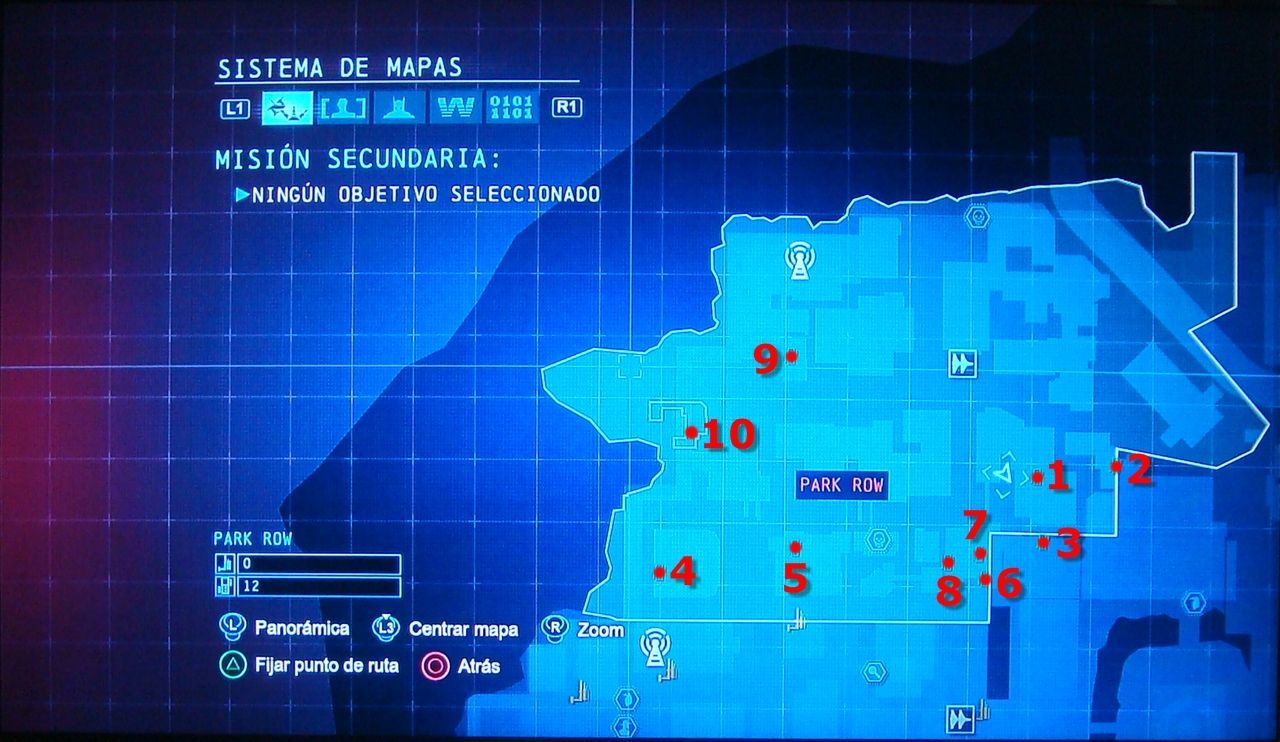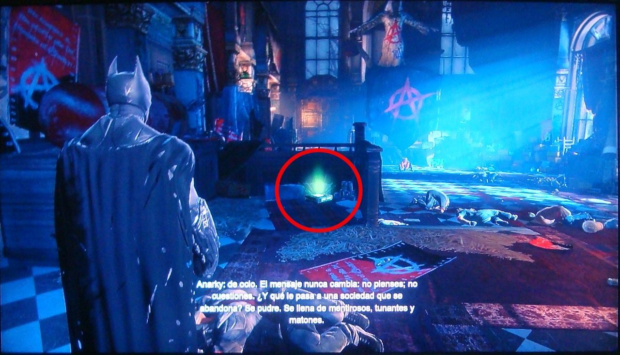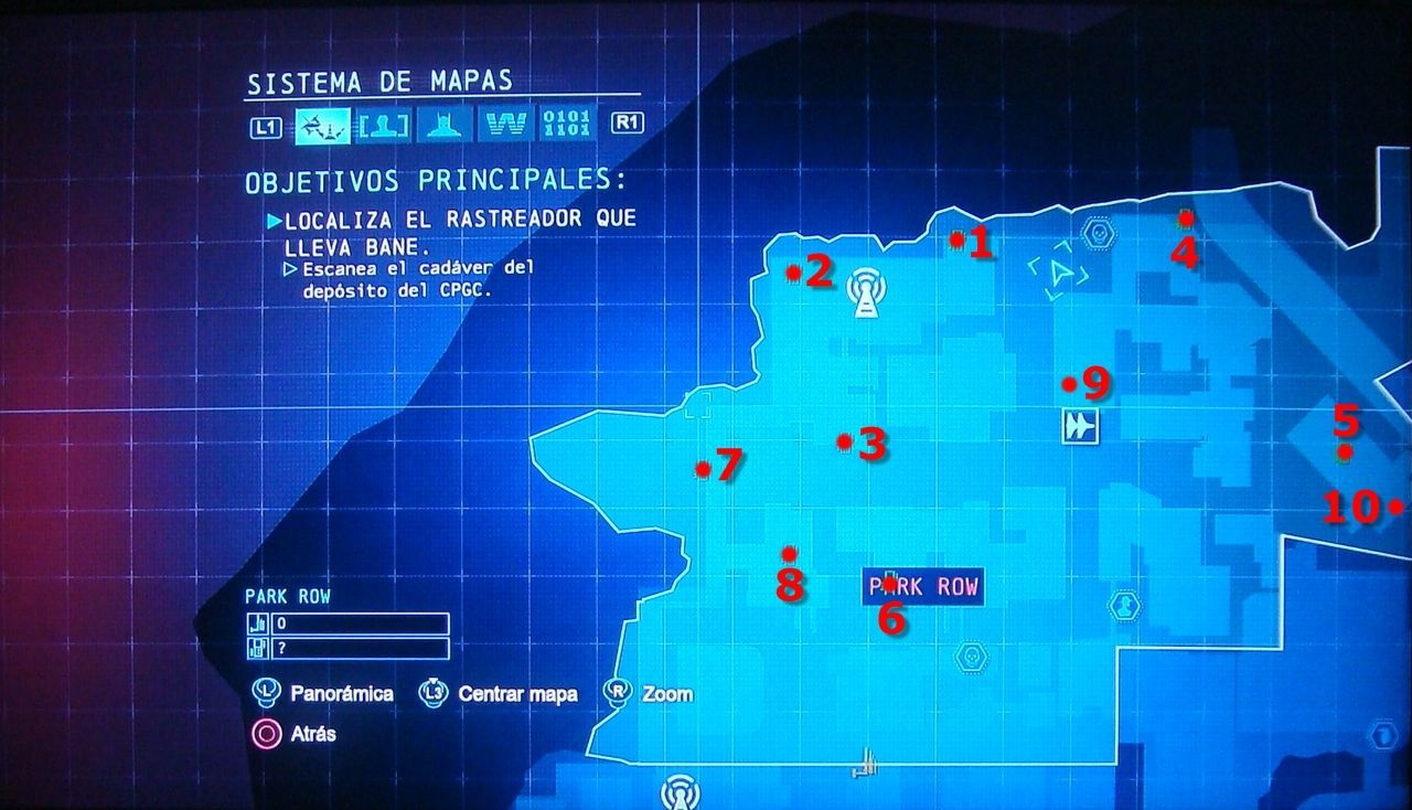 #1-9. (Dentro de los juzgados) Tendrás que haber completado la misión secundaria de Anarky para coger este paquete de datos. Entra por la puerta pequeña dorada que hay al noreste de los juzgados. Busca detrás de la barandilla de la derecha.