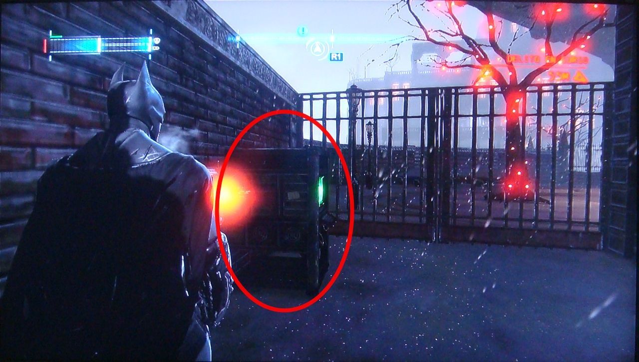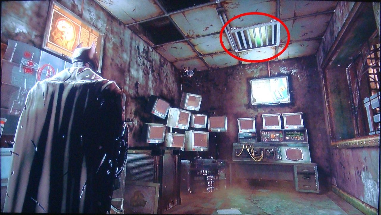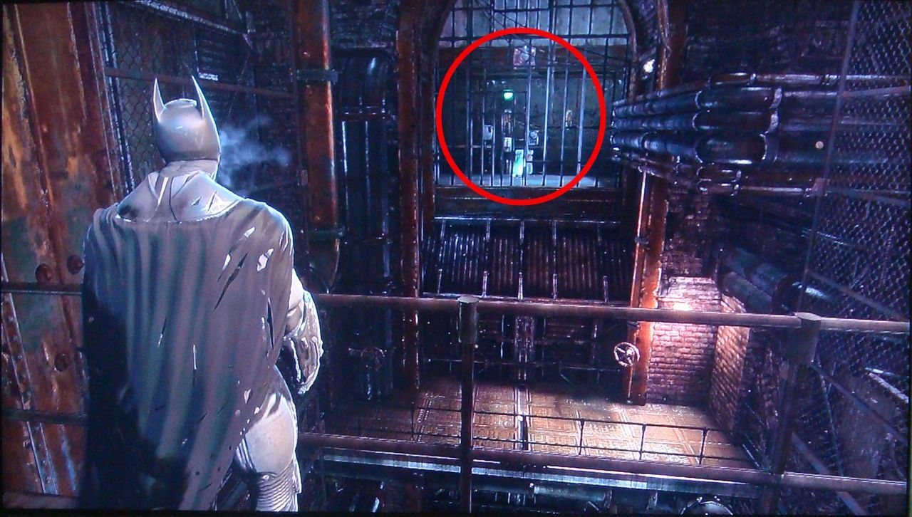 Usa el batarang remoto para lanzarlo a través de la rendija, en la pared derecha de la puerta electrificada. Hazlo pasar ligeramente por la electricidad de dentro para luego darle a la caja de fusibles.