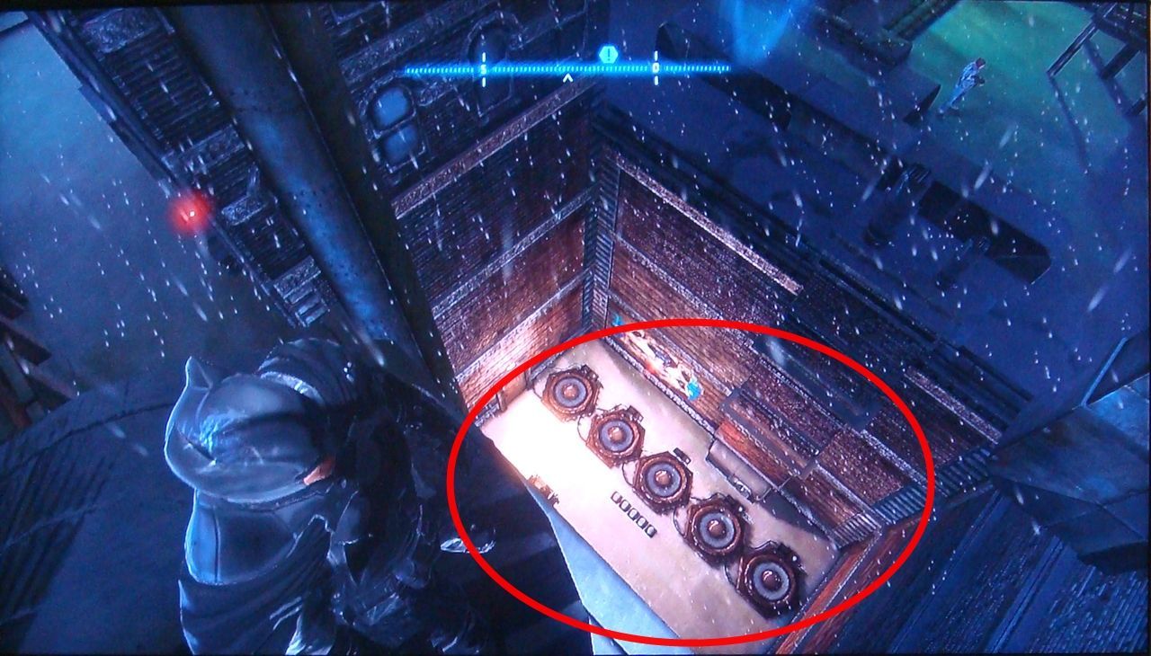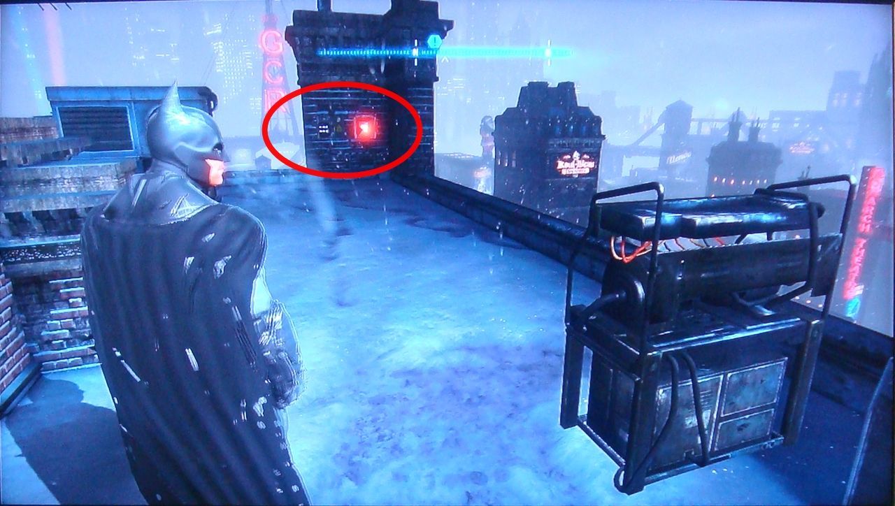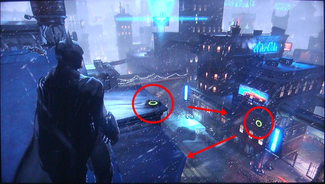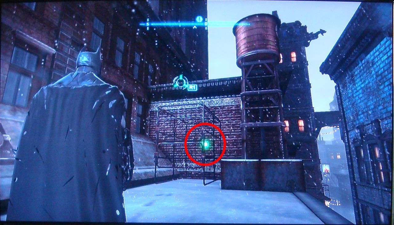 #2-9. Entra por la puerta más al oeste de Park Row, cruza por el conducto y verás el paquete de datos delante. Lanza el batarang remoto por la rendija que hay justo encima de la puerta para dar al interruptor verde de la pared. Usa el garfio teledirigido para crear una tirolina hasta la habitación.
