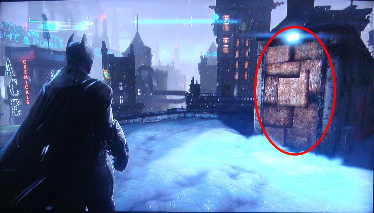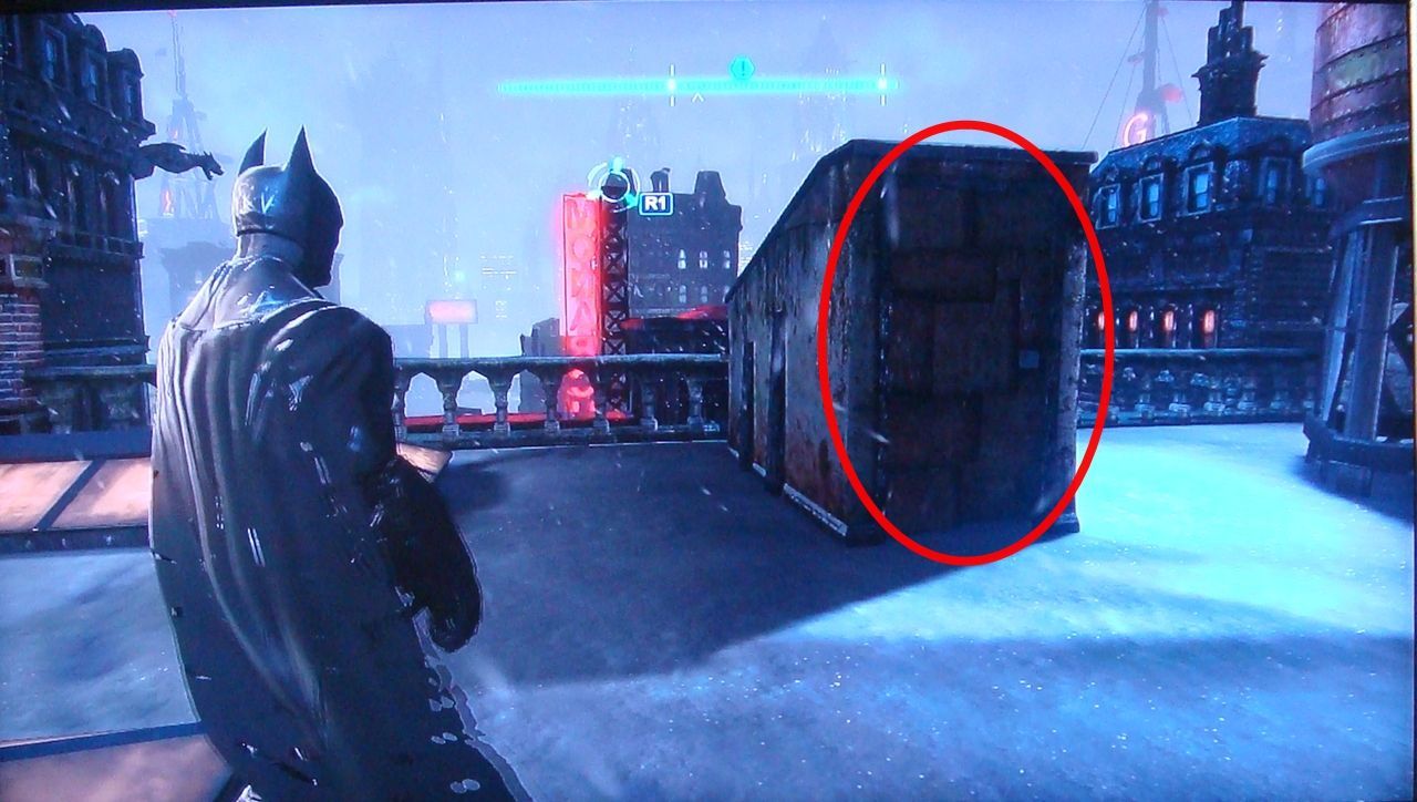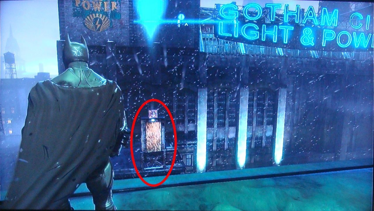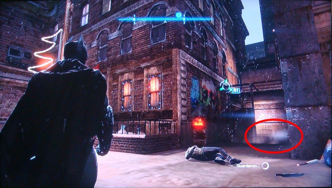 #2-9. Entra por la puerta más al oeste de Park Row, cruza por el conducto y verás el paquete de datos delante. Lanza el batarang remoto por la rendija que hay justo encima de la puerta para dar al interruptor verde de la pared. Usa el garfio teledirigido para crear una tirolina hasta la habitación.