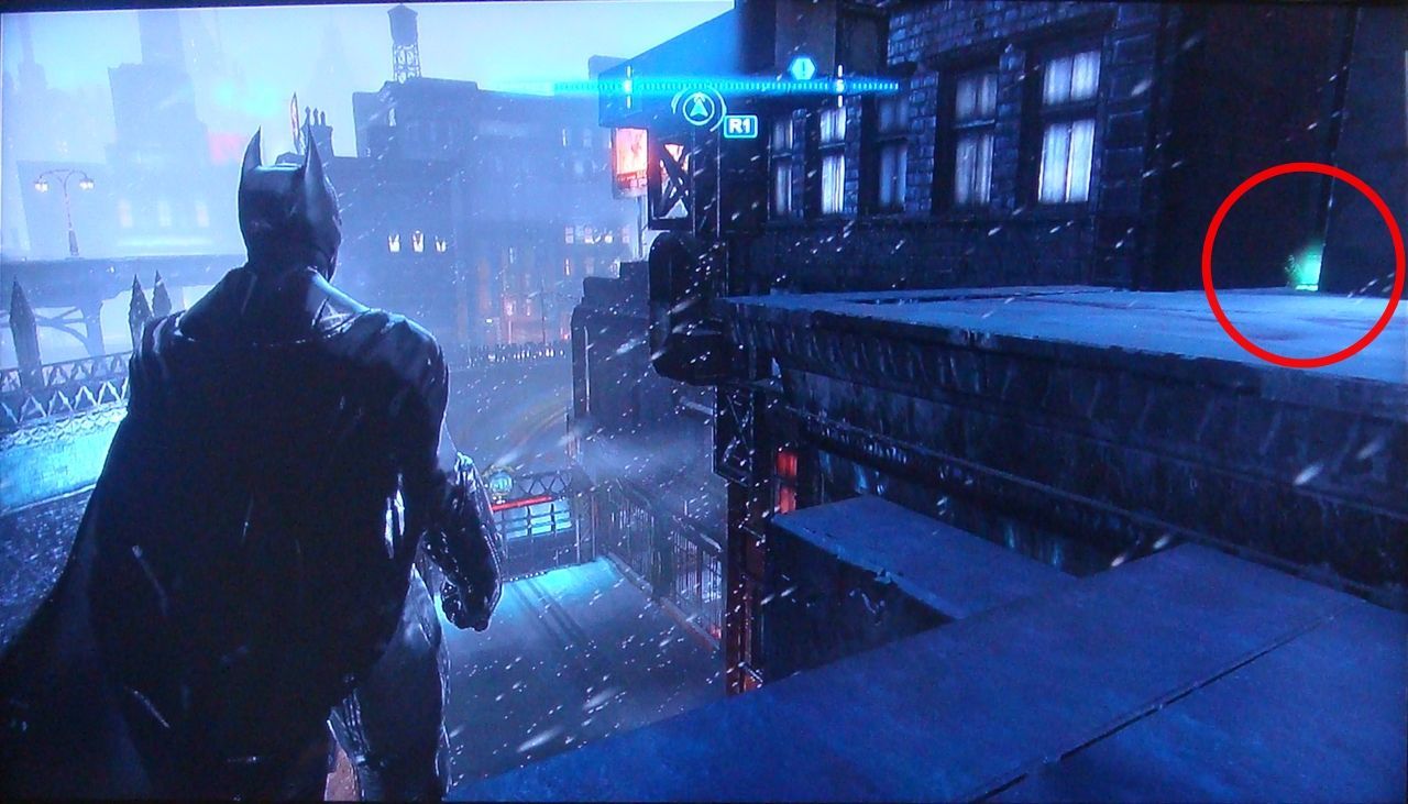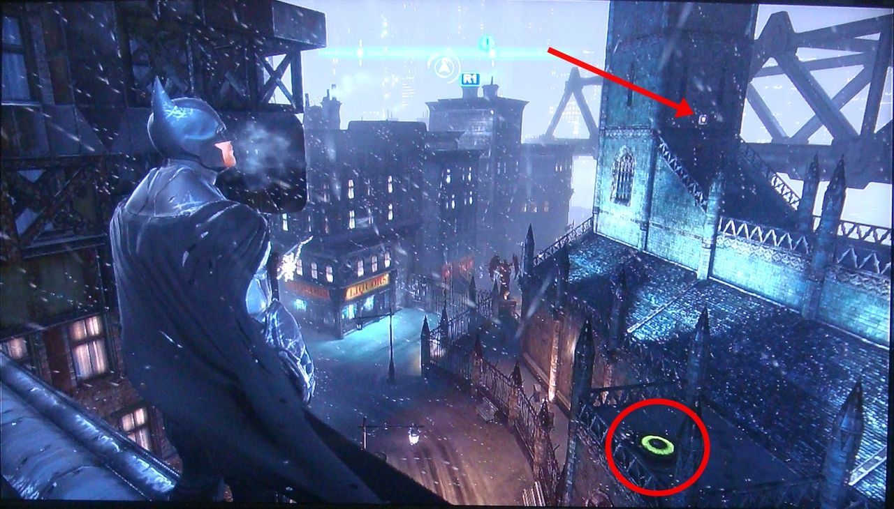 #1-5. Busca la base verde en un tejado al sur de la iglesia, písalo y coge el paquete de datos, pegado en la torre, en menos de siete segundos. La idea es que, nada más comenzar la cuenta atrás, te enganches al tejado principal. Saca rápidamente la batgarra, apunta al paquete de datos y cógelo.