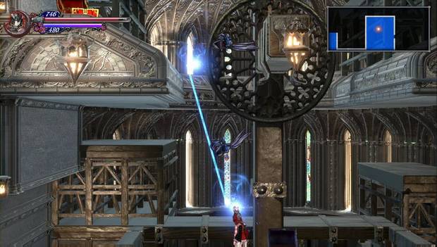 En la galería te esperan otra Armadura Lancera y Leraje, un nuevo enemigo. En esta zona, presta atención al techo: puedes romperlo y subirte a la parte de arriba, donde hay una mejora de vida y una de PM a izquierda y derecha.