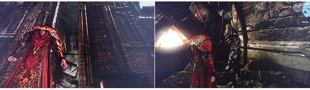 Al dejarnos caer y avanzar un poco nos atacan 2 Demonios Astados, al derrotarlos se ve un rastro de aura violeta por donde debemos ir, para llegar hay que ir por detrás metiéndonos por los arcos justo detrás de donde caemos a la zona y atravesar la reja que nos llevaba a una Caja de Dolor encima de unos containers, y nos reunimos con Alucard, tras escalar el muro y dejarnos caer avanzamos hasta otra sala donde poder usar el Espejo del Destino, entramos en la sala donde el tercer Acólito esta invocando a Satán.
