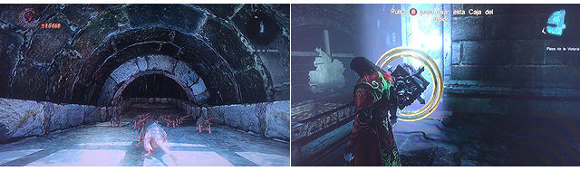 Al subir las escaleras nos encontramos con varios Ciudadanos Poseídos, y detrás en escaleras se ven 2 Cajas de Dolor, desde donde nos atacan los enemigos tenemos a la izquierda una Reja y de frente a la derecha podemos coger la primera caja de dolor.