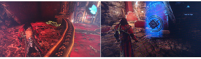 --- Caja de Dolor 3 - Gema de Caos. Antes de continuar por la puerta, si vamos por la izquierda llegamos a la posición de la Caja de Dolor que veíamos desde abajo antes de subir la torre, podemos llegar saltando y usando Niebla para avanzar un pelín más y llegar (activarla al final del salto).