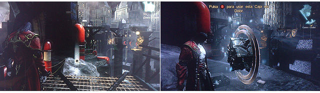 Avanzamos por el puente hasta llegar a un ventilador que nos permite subir usando Niebla. Al llegar arriba nos encontramos 2 Antidisturbios. Desde esta posición vemos otra caja de dolor que no podemos coger (necesitamos las alas demoníacas), por la derecha tenemos una tubería rota con un ventilador que nos lleva hasta una trampilla con una manivela. De frente tenemos unas escaleras y por la izquierda una Reja que nos lleva a la zona anterior.