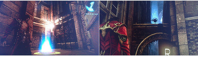 --Caja de Dolor 9 - Gema de Vida Donde vemos el segundo rastro y subimos al Campanario, donde el callejón del Lobo (a la izquierda según salimos), subimos a donde saldría el Lobo y desde aquí girándonos la vemos, necesitamos las Alas Demoníacas para llegar saltando al cartel que pone R.