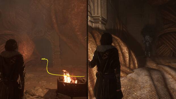 Cerca de las grandes columnas de este lugar puedes recoger cromas en un cadáver. Además, si miras hacia el norte, deberías localizar en el borde de las ruinas unos asideros por los que puedes trepar para llegar hasta una cuerda que baja a una zona con un enemigo Petank.